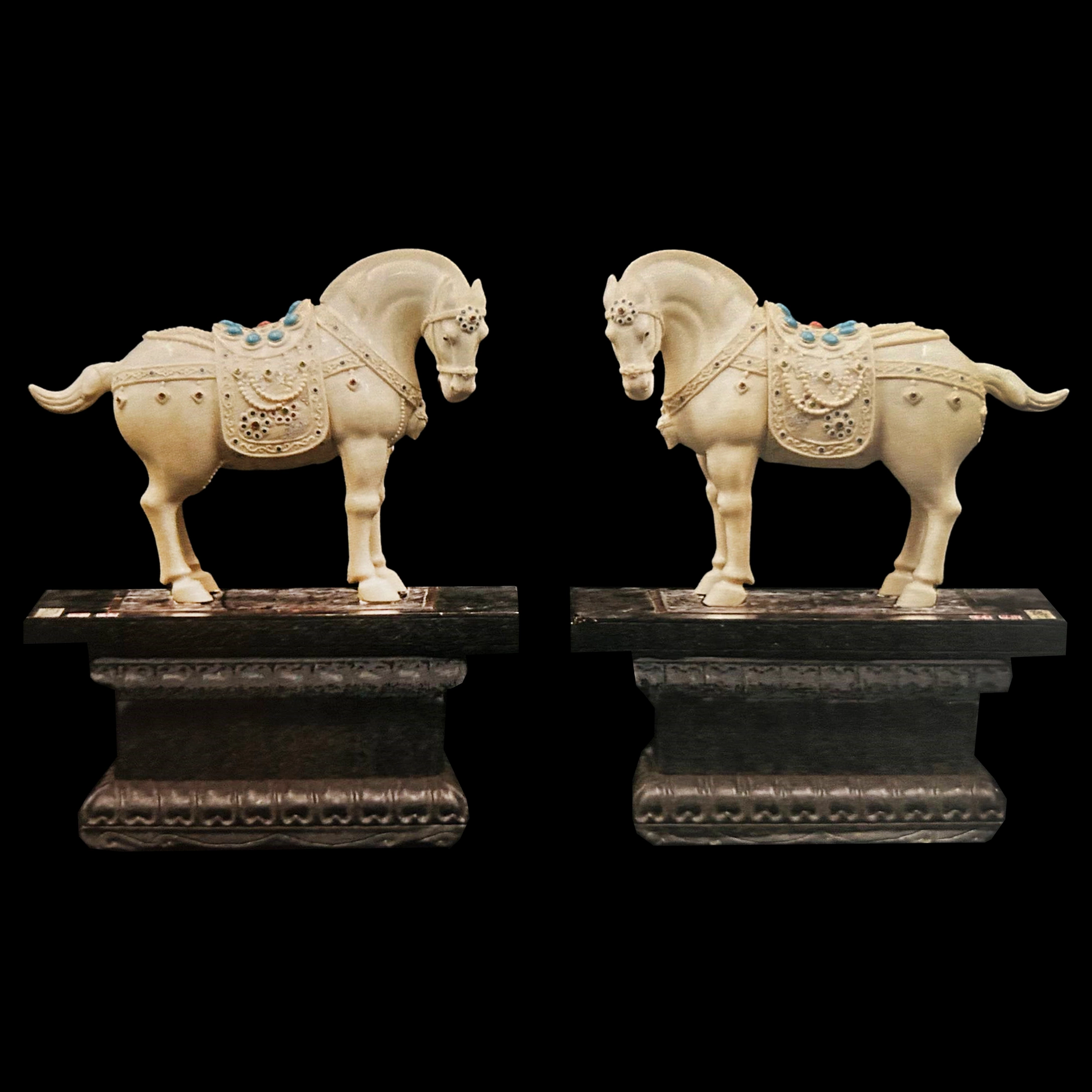 Декоративные элементы на упряжи украшены тонкой резьбой и инкрустацией цветными камнями, что придаёт композиции особую торжественность. Орнаменты напоминают о традиционных украшениях парадных коней в императорских процессиях, символизируя высокий статус и благополучие.