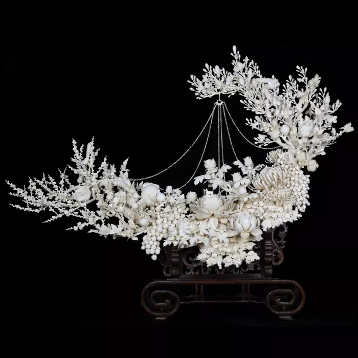 Центральную часть композиции образует подвешенная гирлянда из резных цветов и плодов, соединённых тонкими цепями. Этот декоративный элемент создаёт ощущение движения и воздушности, словно цветочная арка парит в пространстве. Подобная форма напоминает праздничные украшения традиционных восточных садов и храмовых пространств.