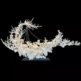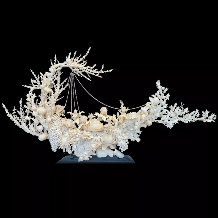 Основу художественного образа составляют цветы, бутоны и декоративные плоды, выполненные с ювелирной точностью. Пышные соцветия, напоминающие пионы и хризантемы, раскрываются в разных стадиях, образуя ритм непрерывного цветения. Ветви, изогнутые в естественном движении, несут на себе изящные элементы, среди которых особенно выделяется подвесная композиция на тонких цепях — она придаёт работе дополнительную динамику и ощущение лёгкости, словно цветущий сад оживает в пространстве.
