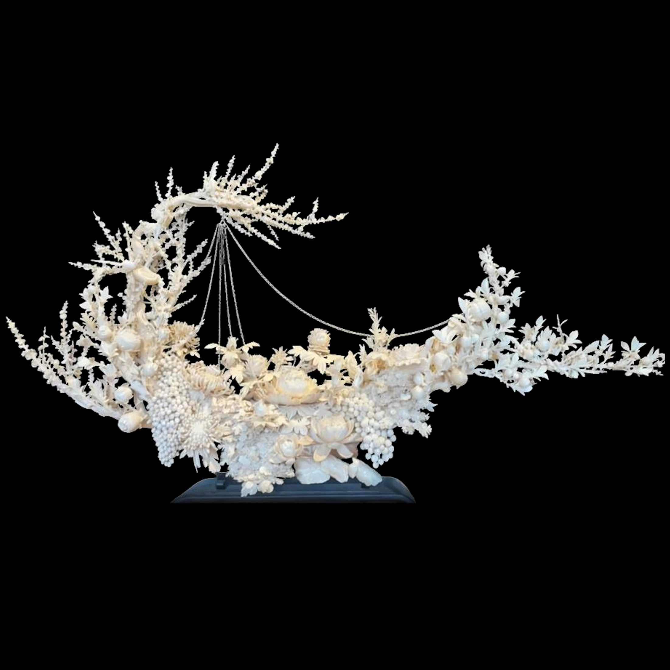 Техника кантонской резьбы здесь доведена до предельной виртуозности: глубокая проработка, многослойная структура и тончайшая ажурность создают эффект кружевной прозрачности. Мастер искусно использует природную текстуру бивня, позволяя свету мягко проникать в глубину резьбы и подчеркивать объём. Контраст с лаконичным тёмным основанием усиливает впечатление сияющей, почти невесомой композиции.
