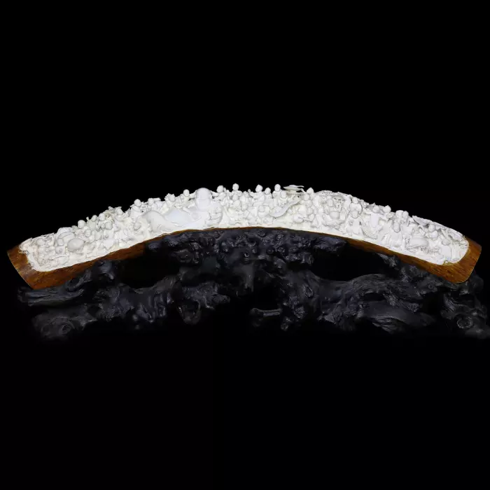 «Веселье Небес, восторг Земли» — это образ идеального состояния мира, в котором царят согласие, радость и процветание. Композиция соединяет редкость бивня мамонта, тончайшее мастерство резьбы и глубокую символику, создавая произведение, наполненное жизненной энергией и благопожелательным смыслом.