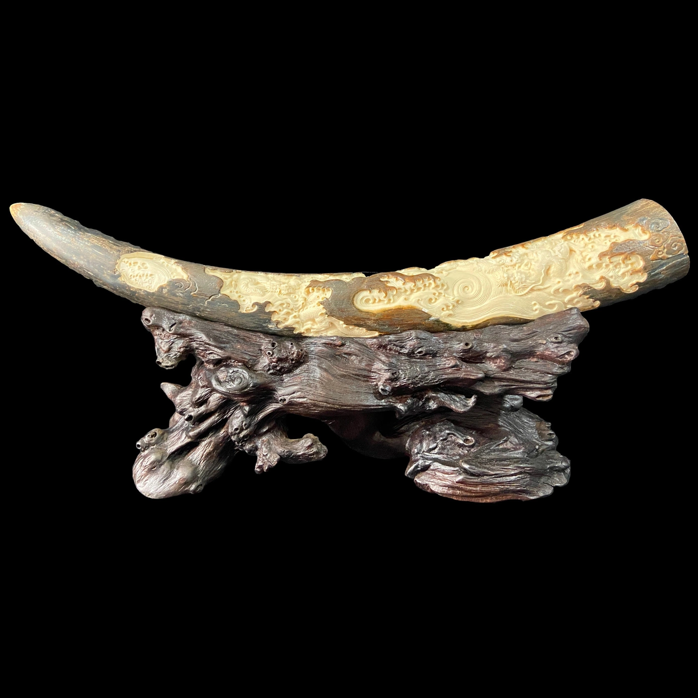 Композиция из бивня мамонта «Владение дракона» представляет собой редкий пример синтеза природной формы и художественного замысла, в котором сам материал становится частью сюжета. Основой служит цельный фрагмент бивня, сохраняющий естественный изгиб и переходы оттенков — от тёплого молочного до глубокого серо-коричневого. Резьба органично вписана в природный рельеф, благодаря чему создаётся ощущение, будто изображение не нанесено, а проявлено изнутри самой кости. Композиция установлена на фигурном деревянном основании, повторяющем текучую пластику формы и усиливающем впечатление природной стихии.