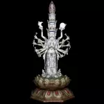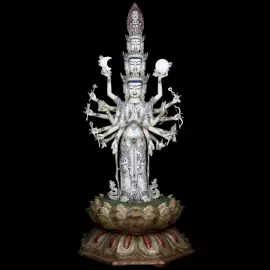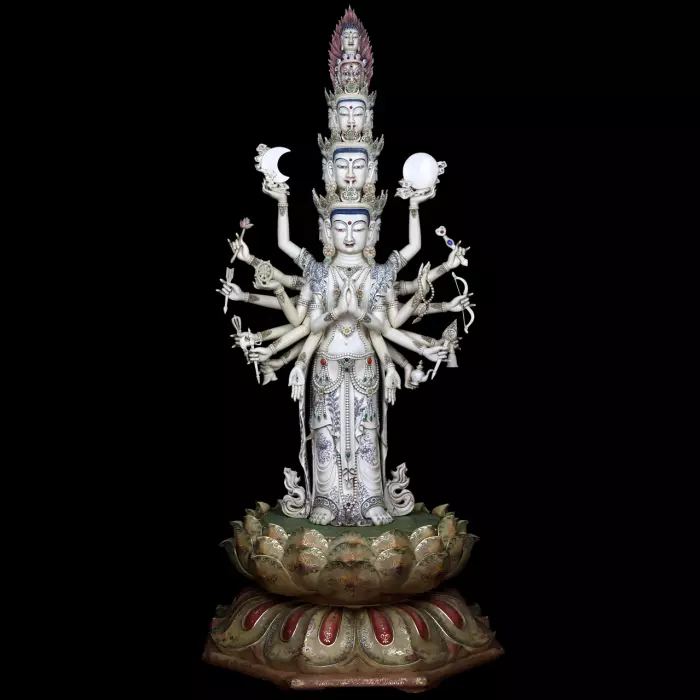 Одежды бодхисаттвы покрыты сложным орнаментом и тончайшими резными узорами, напоминающими роскошные ткани древних дворцов. Тщательная проработка деталей, плавность линий и гармоничное распределение многочисленных рук создают впечатление удивительного баланса и художественной завершённости.