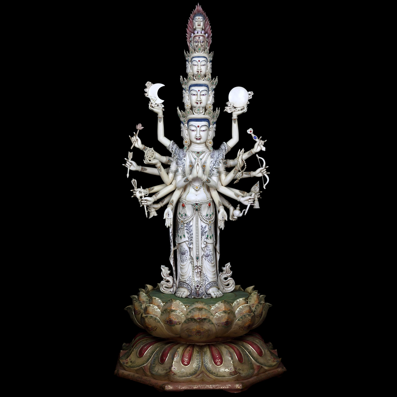Композиция из бивня мамонта «Восемнадцатирукая Гуаньинь» — выдающееся произведение художественной резьбы, воплощающее один из наиболее сложных и символически насыщенных образов буддийской иконографии. Скульптура выполнена из мамонтовой кости и установлена на многоярусном пьедестале в форме раскрытого лотоса — традиционного символа духовной чистоты, просветления и рождения мудрости.