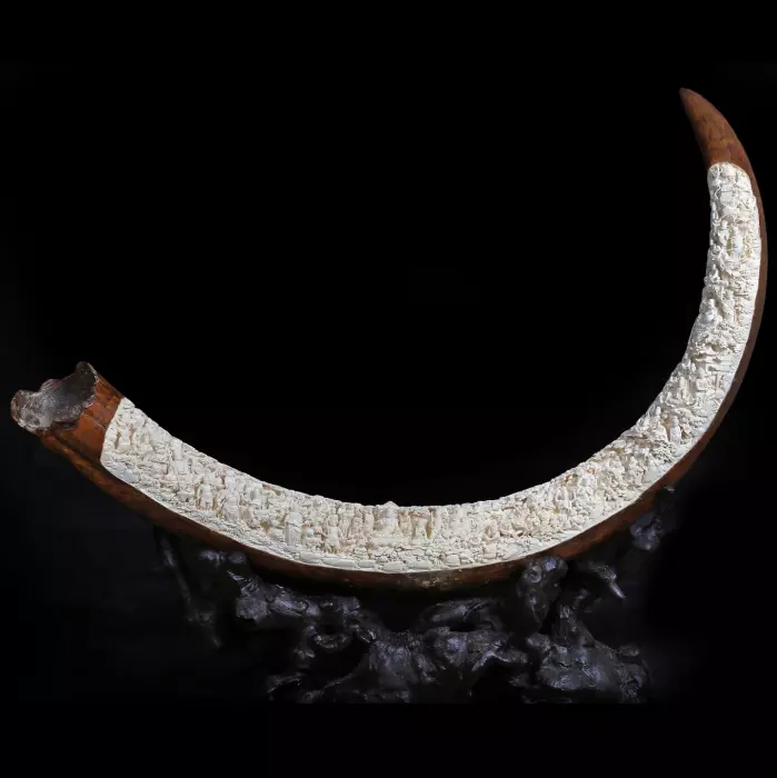 Плавная линия бивня усиливает эффект разворачивающегося духовного пространства, где каждая сцена естественно переходит в следующую. Это создаёт ощущение непрерывного движения — как метафору пути к просветлению, не имеющего резких границ и завершающегося не в точке, а в состоянии.