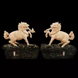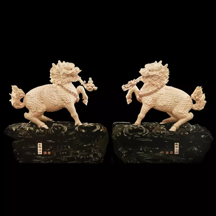 Композиция из бивня мамонта «Золотой Цилинь приносит сына» воплощает один из древнейших благопожелательных сюжетов китайской культуры. В центре образа — мифическое существо цилинь, благородное небесное животное, которое появляется лишь в эпохи справедливости и гармонии. Его появление считалось знаком небесного благословения, а в народной традиции он стал символом счастливого потомства и продолжения рода.