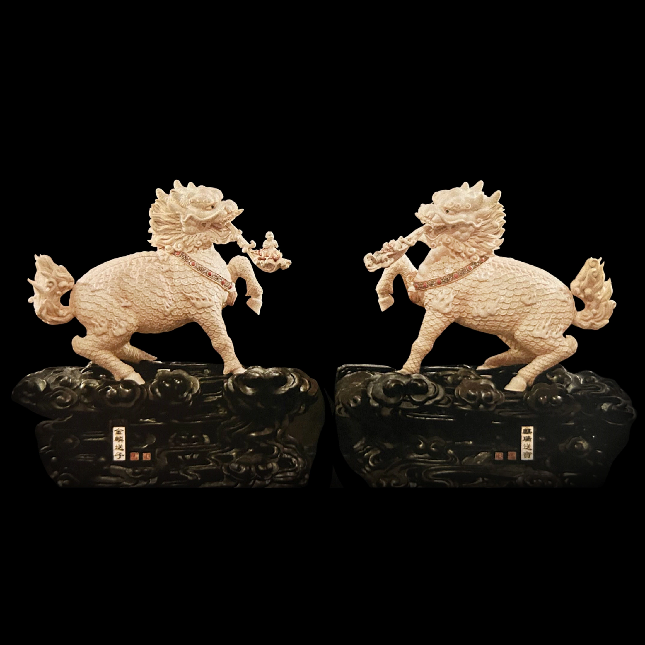 В композиции представлены два величественных цилиня, обращённые друг к другу. Их мощные тела покрыты чешуйчатым узором, напоминающим драконью броню, а головы сочетают черты дракона, льва и оленя — характерные признаки этого мифического существа. В пасти каждого цилиня — фигурка младенца, символ небесного дара, посланного семье.