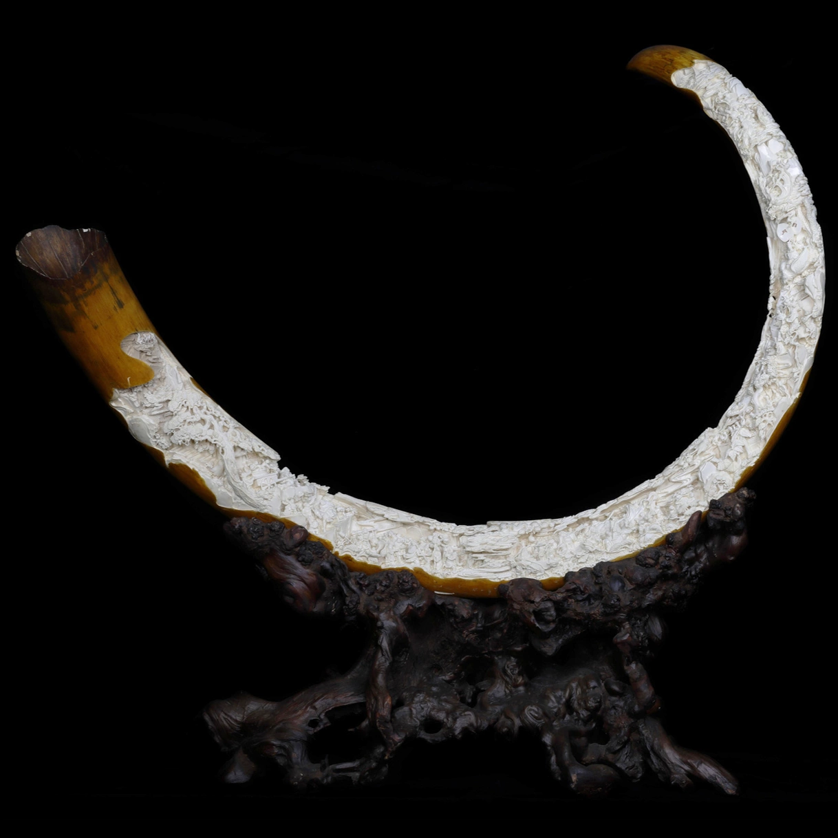 Вдоль внутренней поверхности бивня выполнена тончайшая многоуровневая резьба. Светлая поверхность мамонтовой кости покрыта многочисленными сценами, в которых можно увидеть людей, мудрецов, небесных существ и персонажей традиционной восточной символики. Они располагаются среди павильонов, мостов, горных пейзажей и деревьев, образуя сложную панораму, наполненную движением и жизнью. Каждая фигура проработана с высокой степенью детализации, благодаря чему вся композиция воспринимается как непрерывное повествование.