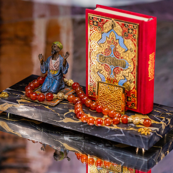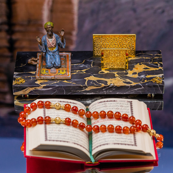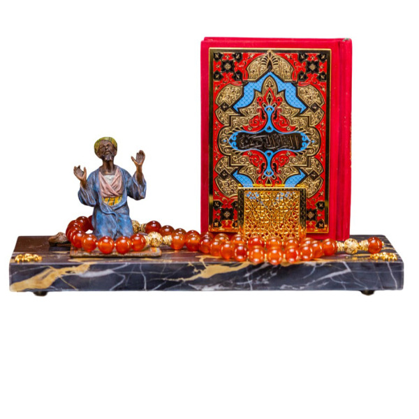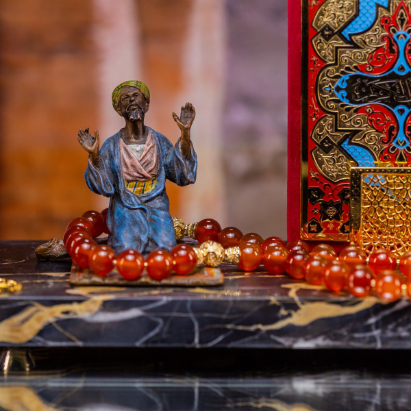 Символ Веры заключен в этой композиции, словно фрагмент древней истории, который открывает свои тайны тому, кто понимает истинную суть роскоши и величия. На мраморной основе возвышается фигура молящегося, чьи воздетые руки словно просят небесное благословение, подчеркивая неразрывную связь между человеком и вечностью. Детализированная поза и яркие, эмалированные одежды переносят в мир глубокой духовности и мудрости Востока.