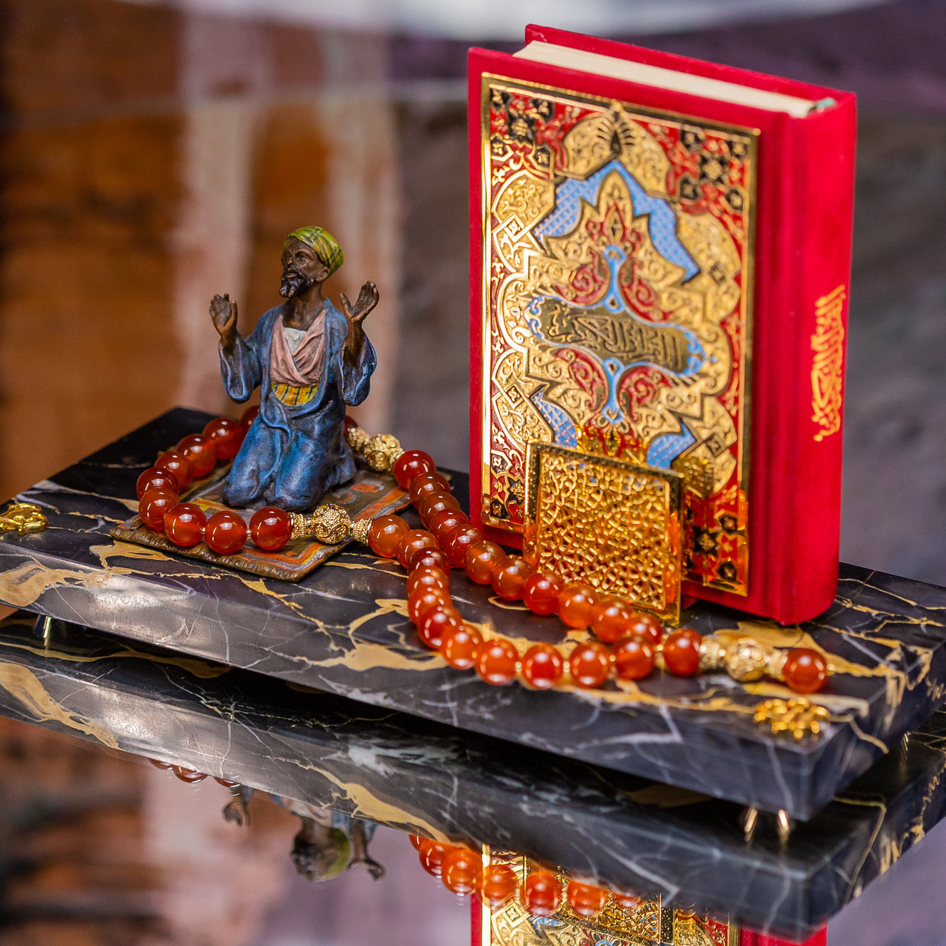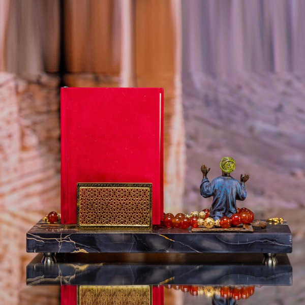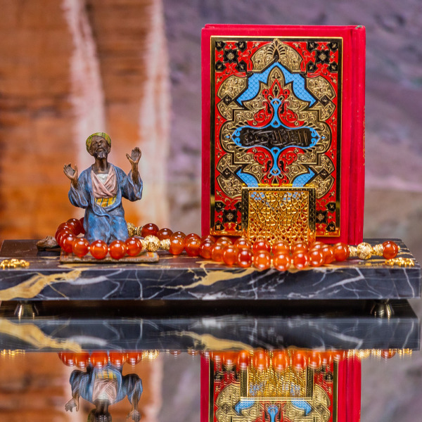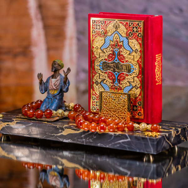 Перед ним лежит искусно оформленный Коран, окрашенный в насыщенный алый цвет — символ силы и страсти. Его резные орнаменты, словно повторяющие ритмы древних молитв, зовут к звездам, создавая игру света и тени, которая напоминает о закатных лучах над песками пустыни, о вечных поисках истины и паломничествах в неизведанное.