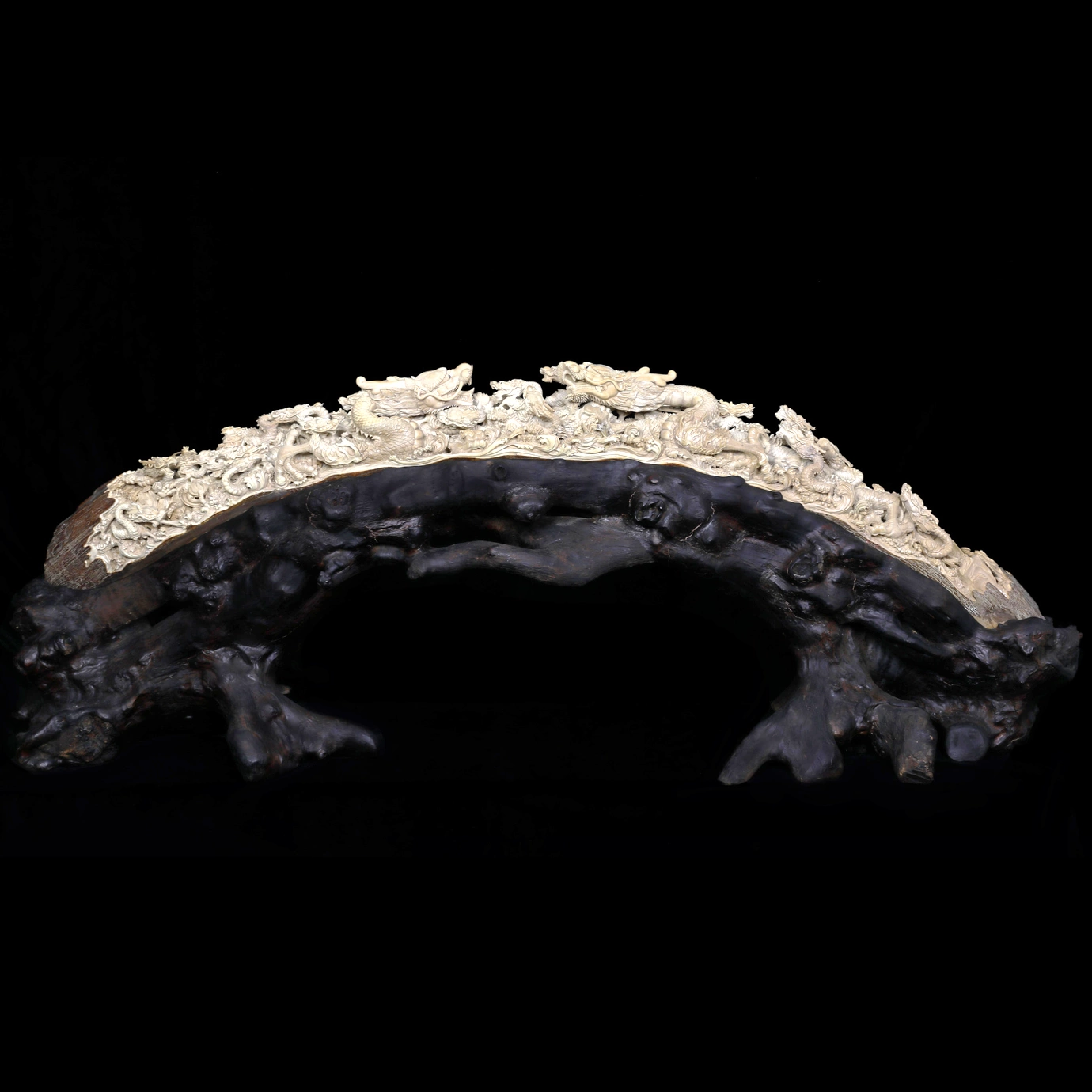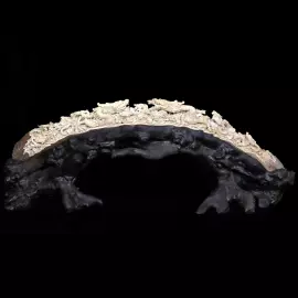 Композиция из кости «Цветущая держава Дракона» представляет собой сложное декоративное произведение, в котором древняя символика Китая соединяется с выразительной пластикой резьбы. Скульптура выполнена на основе изогнутого фрагмента кости, форма которого задаёт композиции динамичную, почти архитектурную линию. Светлая резная часть контрастирует с массивной подставкой из тёмного дерева, создавая ощущение устойчивости и величия.