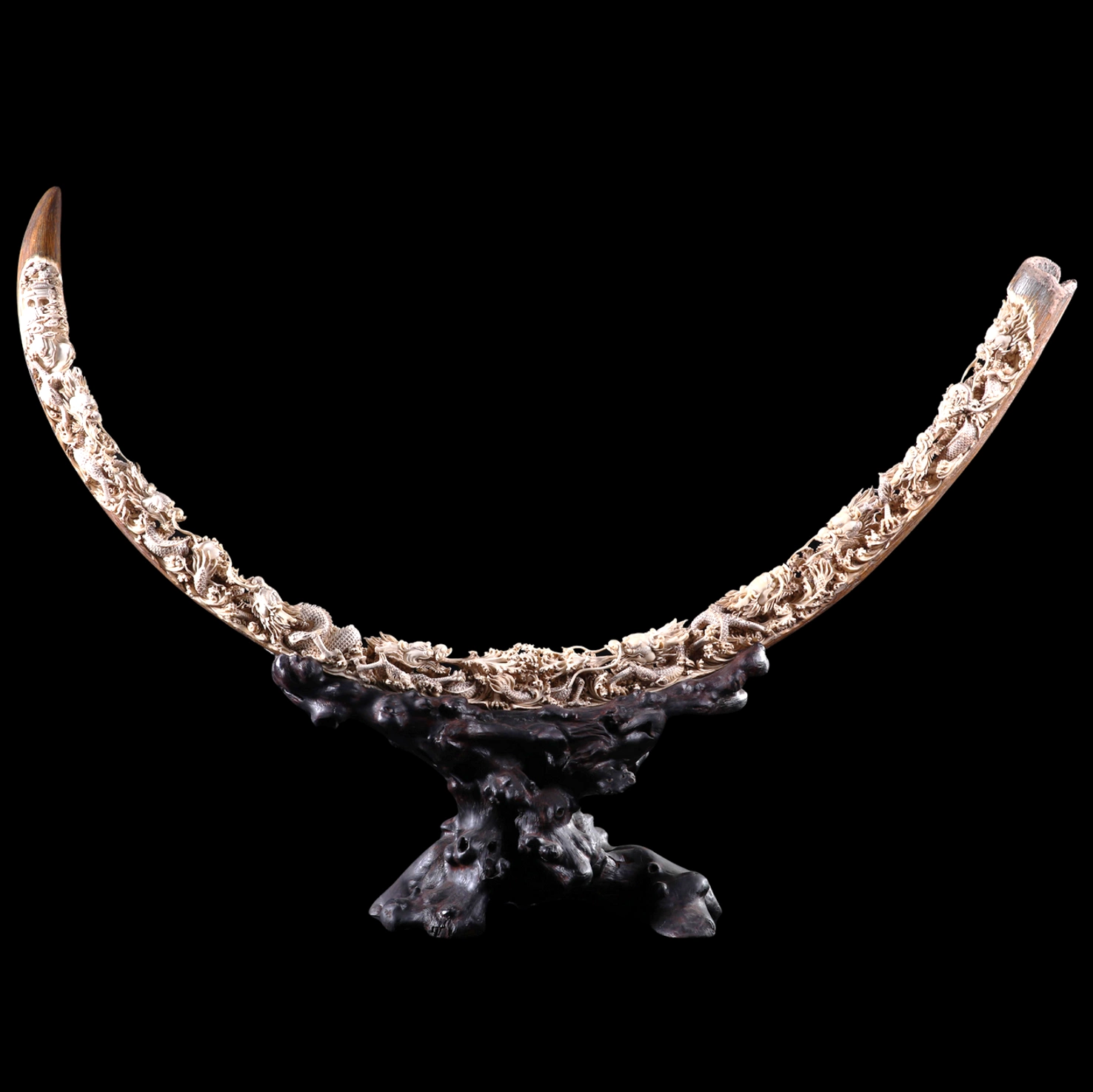 Вдоль внутренней поверхности бивня разворачивается сложный рельеф, населённый фигурами драконов. Девять мифических существ изображены в движении — их тела извиваются, переплетаются, поднимаются и устремляются вперёд, словно играя среди бурных потоков воды. Каждая фигура выполнена с высокой степенью детализации: тщательно проработаны чешуя, когти, гривы и выразительные черты морд.