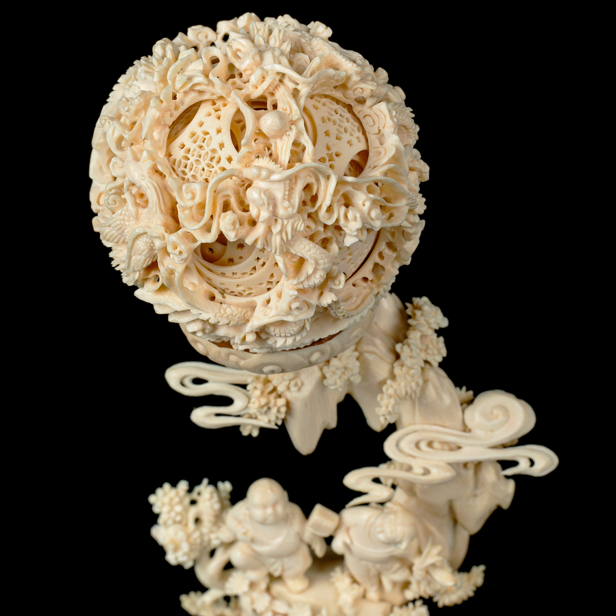 Кантонский шар из слоновой кости, известный также как «призрачный шар», — один из наиболее характерных видов гуанчжоуской резьбы, сформировавшийся ещё в эпоху династии Мин. Его уникальность заключается в том, что цельный фрагмент кости выдалбливается в многослойную сферу с переплетающимися ажурными оболочками. Каждый слой тонко проработан собственным сквозным орнаментом и может свободно вращаться внутри последующего, создавая впечатление лёгкости и почти невесомой прозрачности.