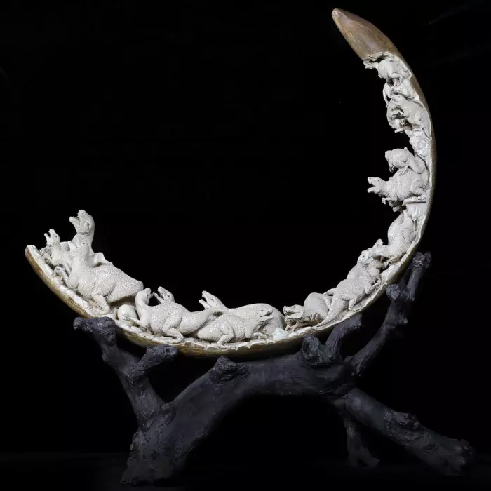 Основой композиции становится изогнутая форма бивня, напоминающая серп молодой луны. Эта природная линия превращена мастером в своеобразный путь времени, вдоль которого разворачивается сцена первобытной жизни. На поверхности бивня размещены фигуры древних животных — динозавров и доисторических существ, изображённых в динамичных позах. Они словно движутся вдоль изгиба кости, создавая впечатление непрерывного течения эпох.