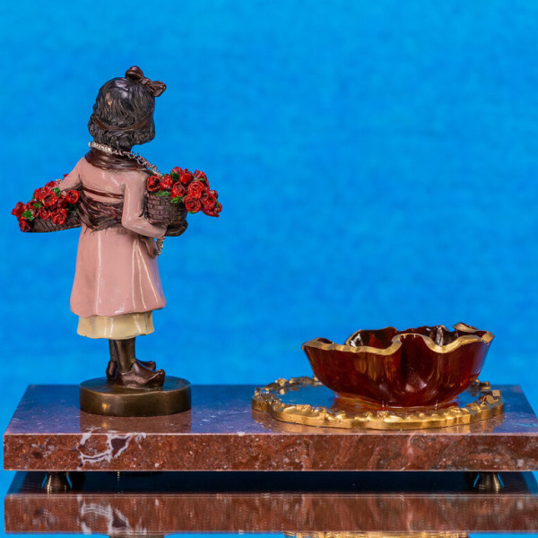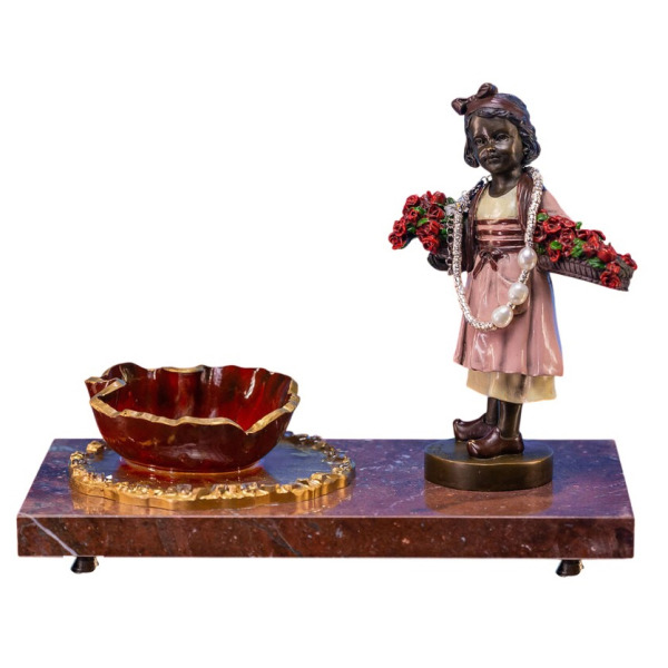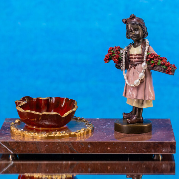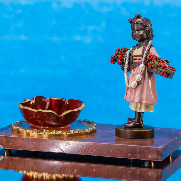 Композиция "Нежность" — воплощение трогательной девичьей мечты, утончённого искусства и элегантности. Перед вами шедевр, в котором скульптурная бронзовая фигурка маленькой девочки с букетом роз в руках рассказывает целую историю детства, символизируя невинность и чистоту. Её платье, расписанное эмалью, украшает композицию, как первый луч солнца, пробивающийся сквозь облака. Каждая складка ткани в её одежде передана с такой детализацией, что кажется, будто фигура вот-вот оживёт, заставив нас вернуться в детство.