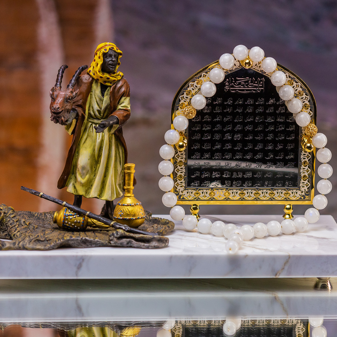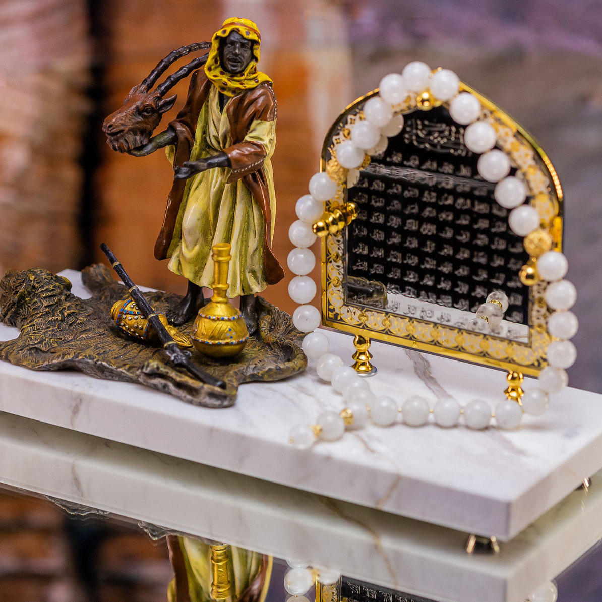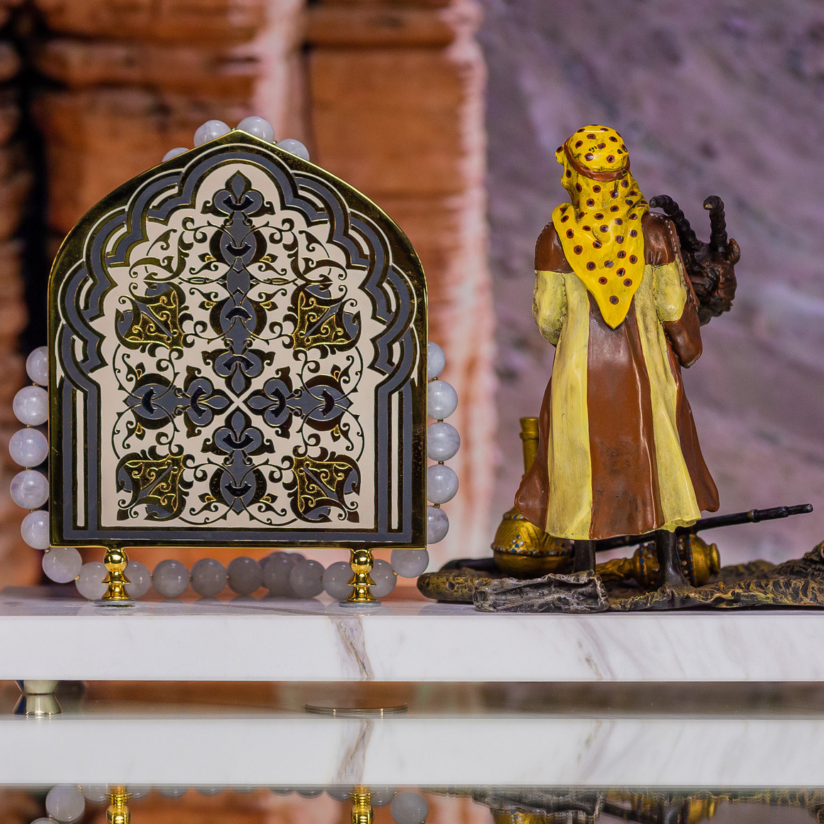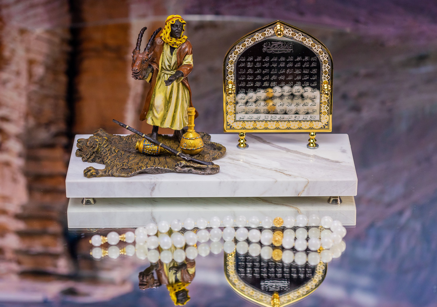 Фигура гордого бедуина, который держит в руках голову дикого горного козла, символизирует победу, силу и древние традиции охоты. Его яркий наряд изящно подчёркивает контраст между миром дикой природы и утончённой культурой Востока. Орнаменты на табличке напоминают о бесконечной игре времени, где каждый шаг — это ход к величию и власти.