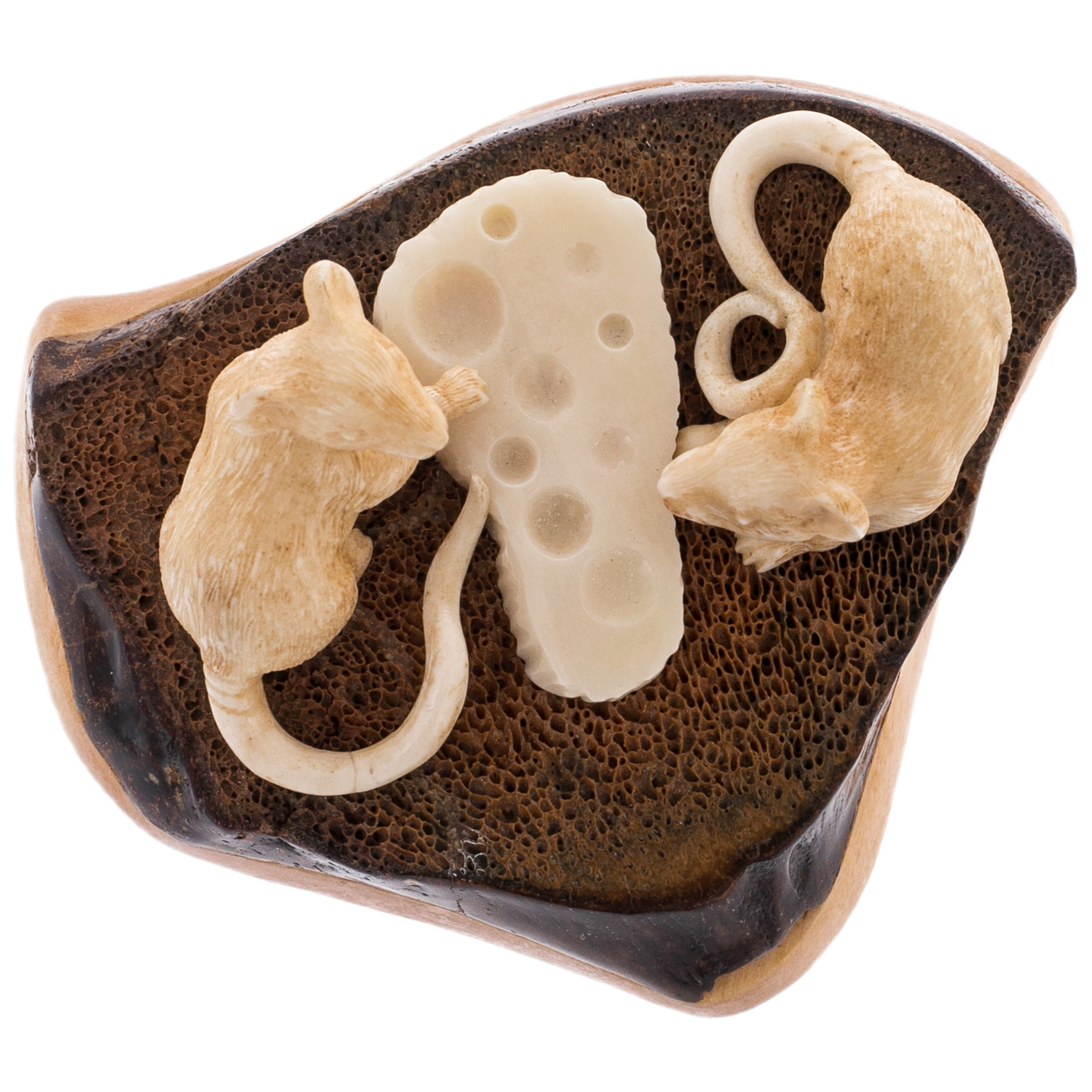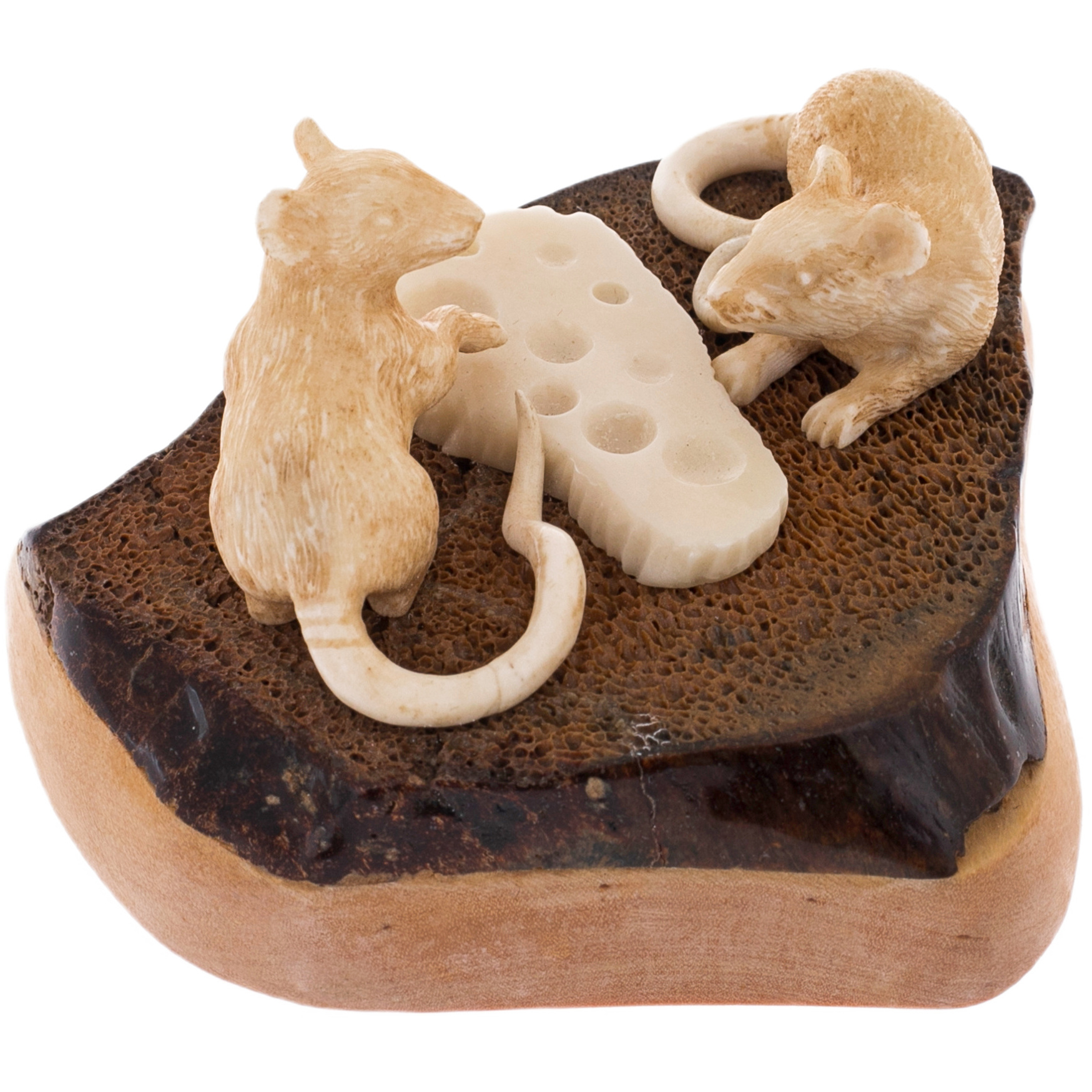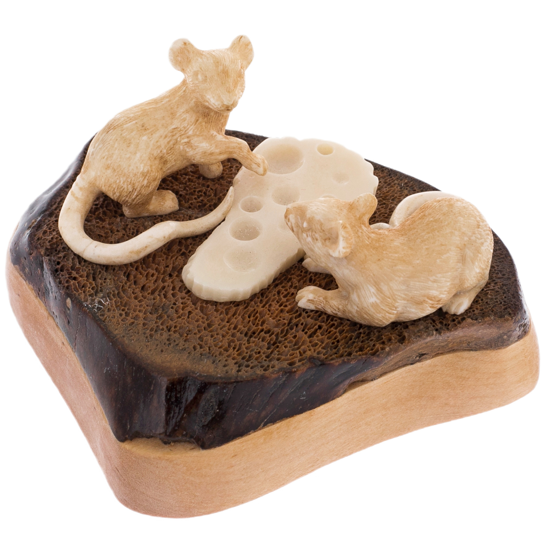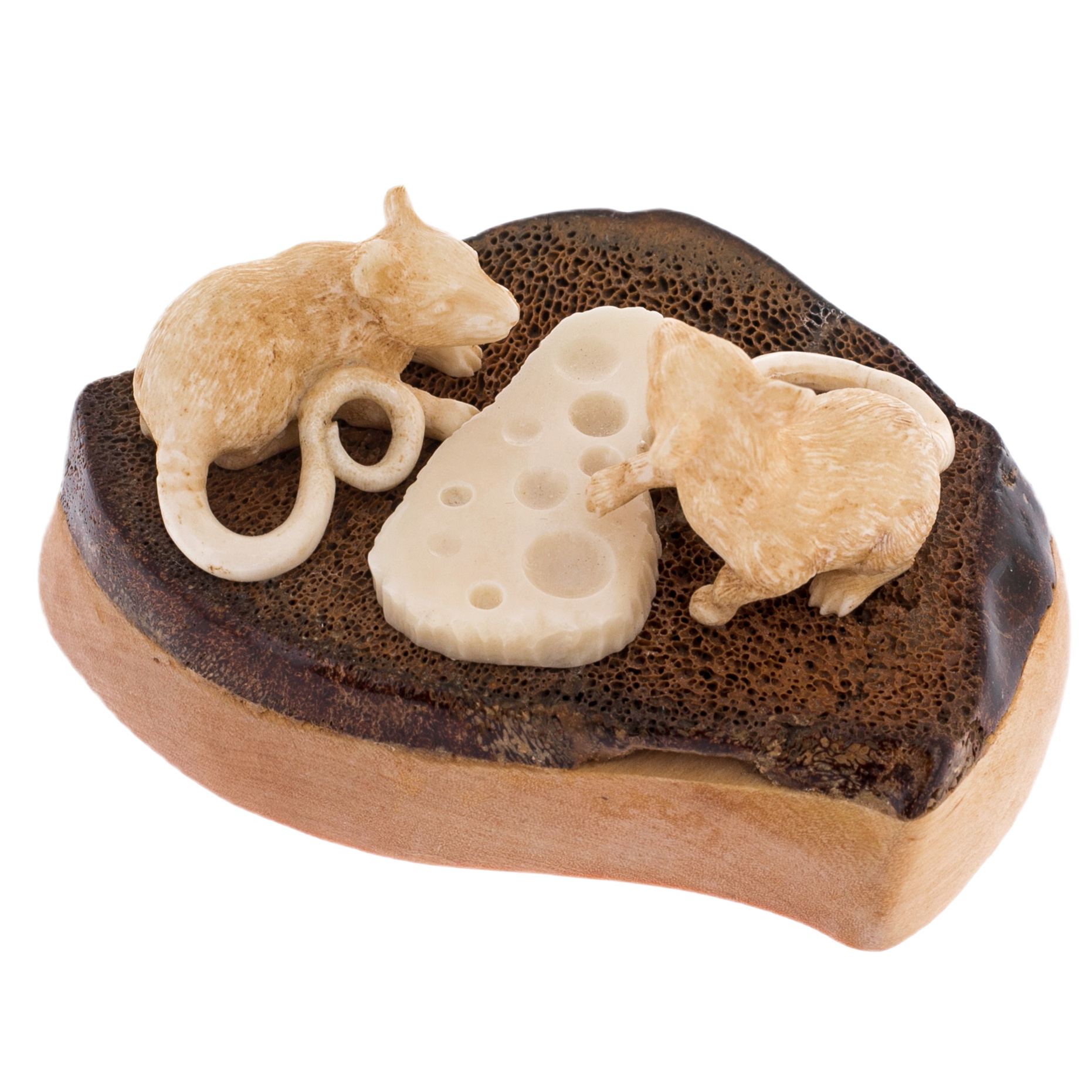 На этой природной сцене разыгрывается маленькая драма: две изящно вырезанные мышки словно застигнуты в момент тайного заговора. Их крошечные лапки, устремлённые к кусочку сыра, создают ощущение трогательной наивности, а изогнутые хвостики — словно завитки рукописного текста, дополняющие гармонию композиции. Сыр, выполненный из того же рога, кажется столь аппетитным, что можно ощутить его нежность даже глазами. Пористая поверхность сыра — словно обещание удовольствия, хранящее тайну искусства мастера.