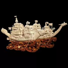 Восьмиэтажные корпуса украшены павильонами, резными балками и расписными постройками с открывающимися дверями и окнами. Подвесные колокольчики, изящные светильники и флаги, колышущиеся на ветру, создают впечатляющую и торжественную атмосферу. От носа до кормы — в каютах, павильонах и башнях — размещены 1265 и 978 миниатюрных фигур соответственно; каждая из них обладает индивидуальными чертами и выражением лица, подчёркивая тонкость художественной проработки.