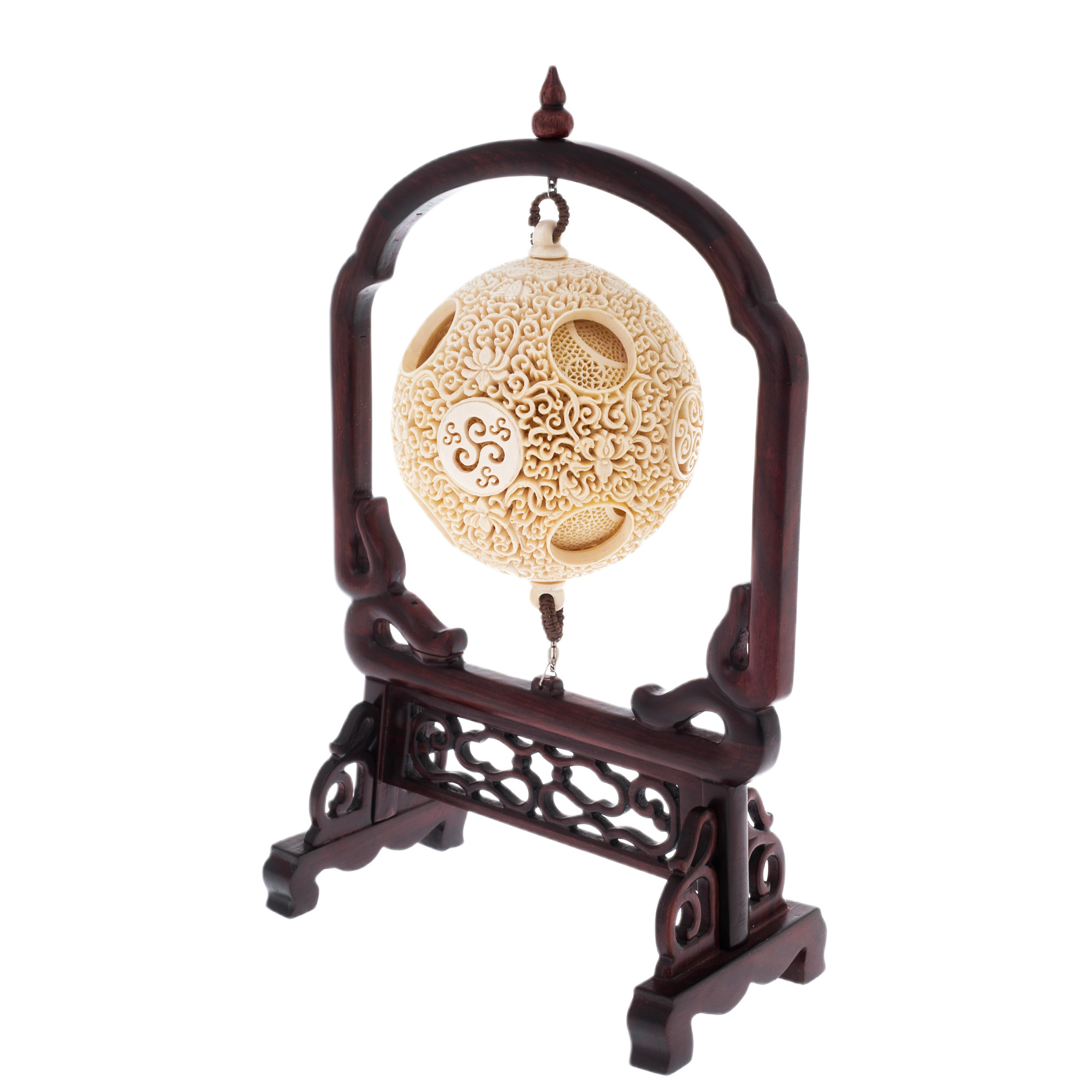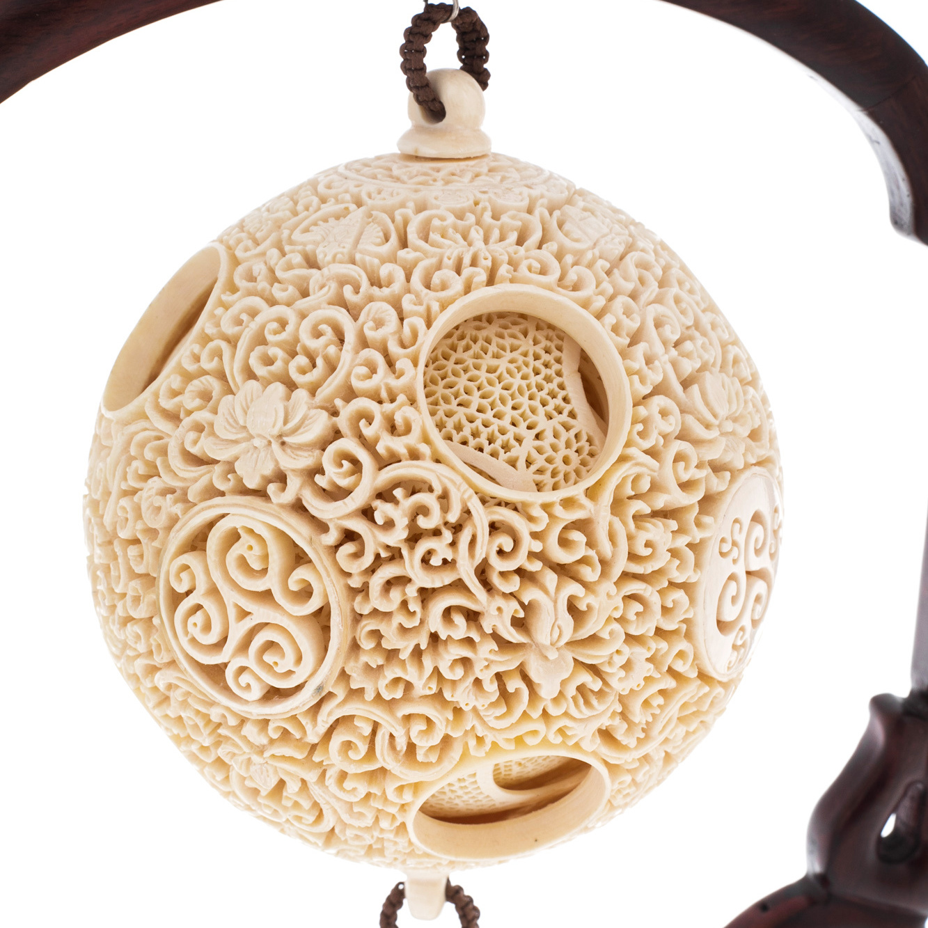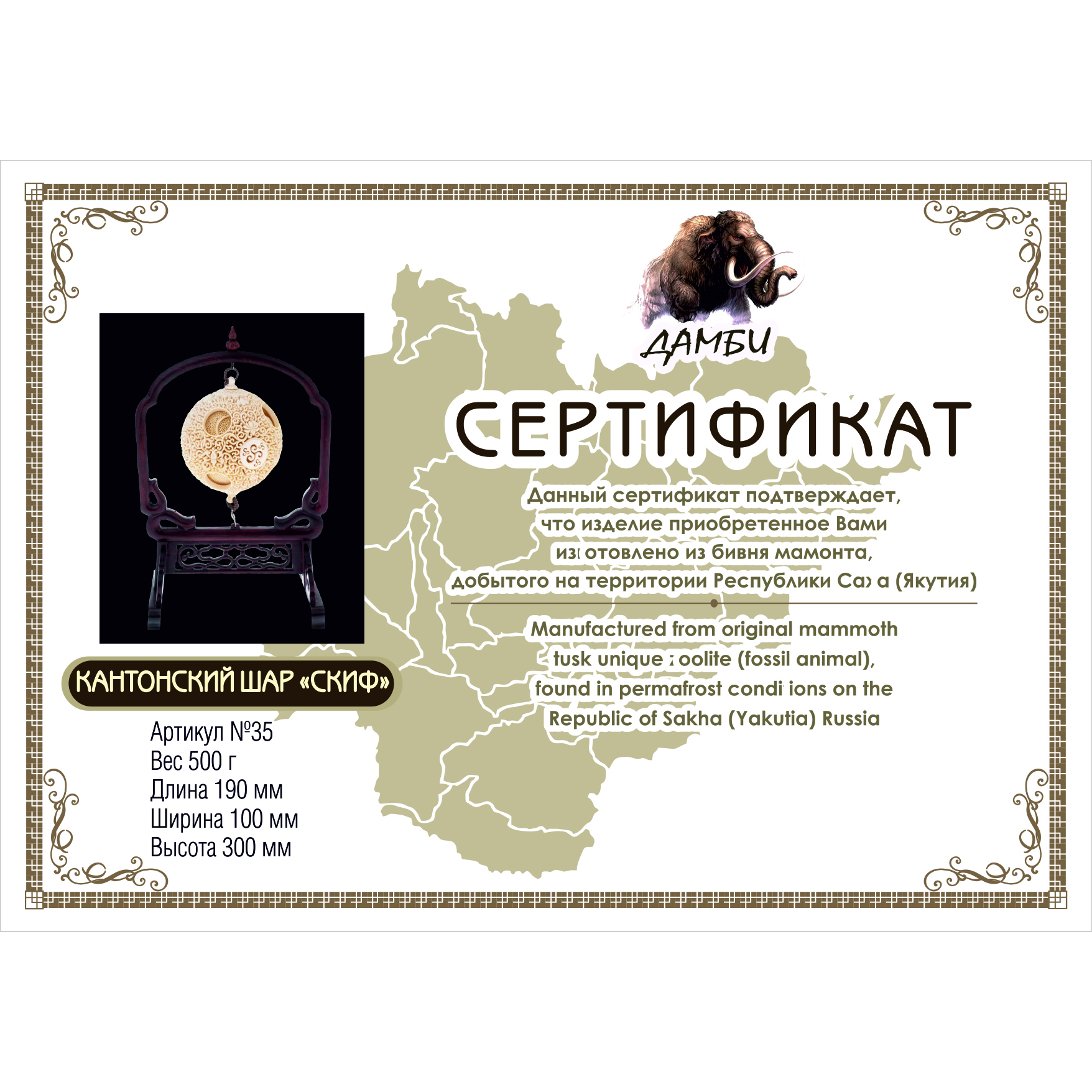 Скульптура «Кантонский шар» — многослойная пространственная загадка, выполненная из цельного фрагмента бивня мамонта и подвешенная в арке из благородного дерева. Внутри главной сферы скрыты тончайшие шары, свободно вращающиеся друг в друге, вырезанные без склеек и соединений. Наружная поверхность покрыта рельефным орнаментом с восточными мотивами, сквозь проёмы которого открываются внутренние слои. Каждая деталь доведена до совершенства вручную, что подчёркивает высочайший уровень исполнения. В комплект входит лакированный кейс с индивидуальной защитной формой.