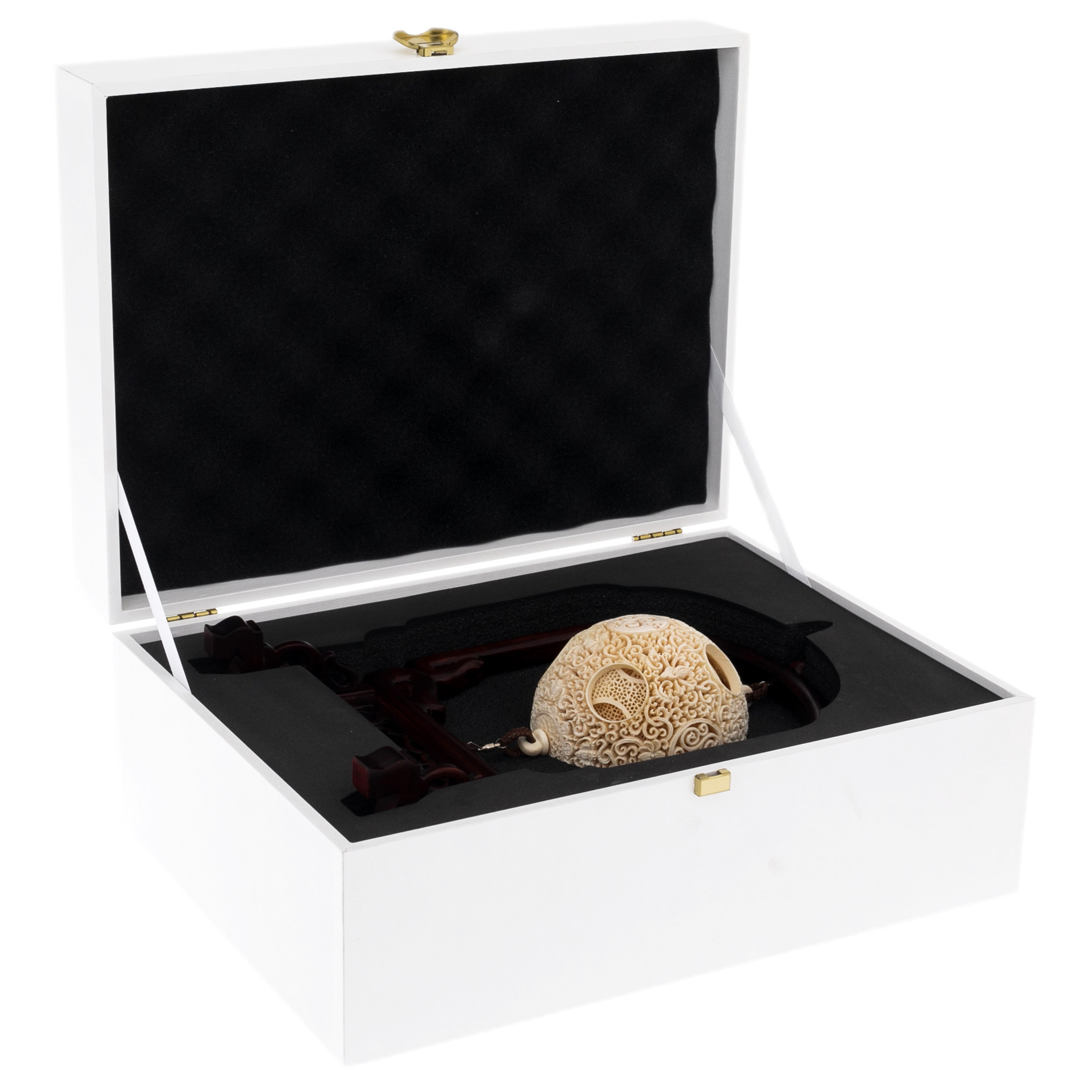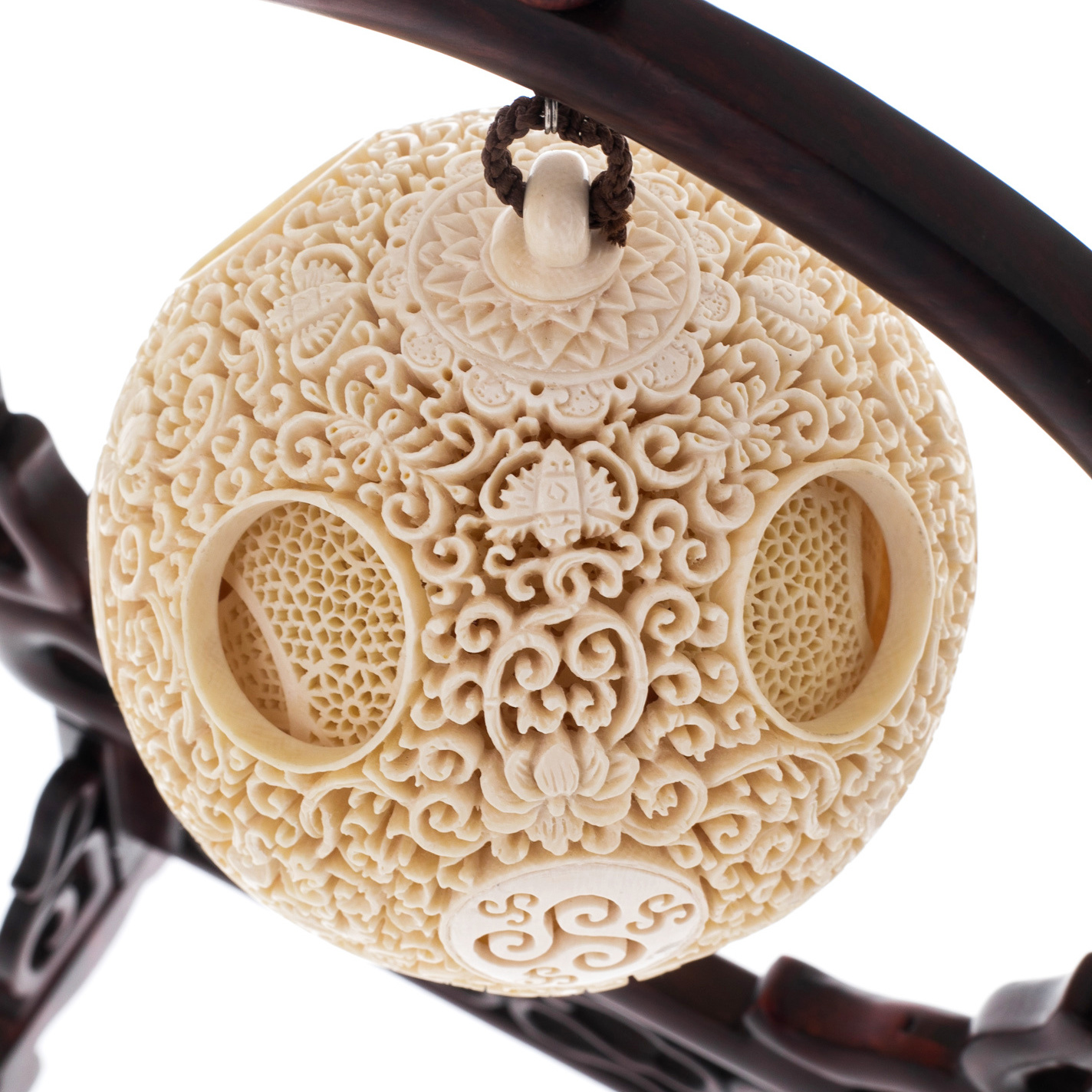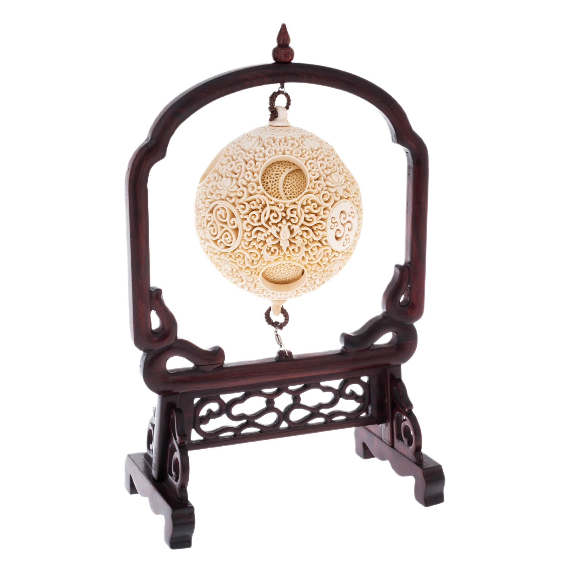 Скульптура «Кантонский шар» — многослойная пространственная загадка, выполненная из цельного фрагмента бивня мамонта и подвешенная в арке из благородного дерева. Внутри главной сферы скрыты тончайшие шары, свободно вращающиеся друг в друге, вырезанные без склеек и соединений. Наружная поверхность покрыта рельефным орнаментом с восточными мотивами, сквозь проёмы которого открываются внутренние слои. Каждая деталь доведена до совершенства вручную, что подчёркивает высочайший уровень исполнения. В комплект входит лакированный кейс с индивидуальной защитной формой.