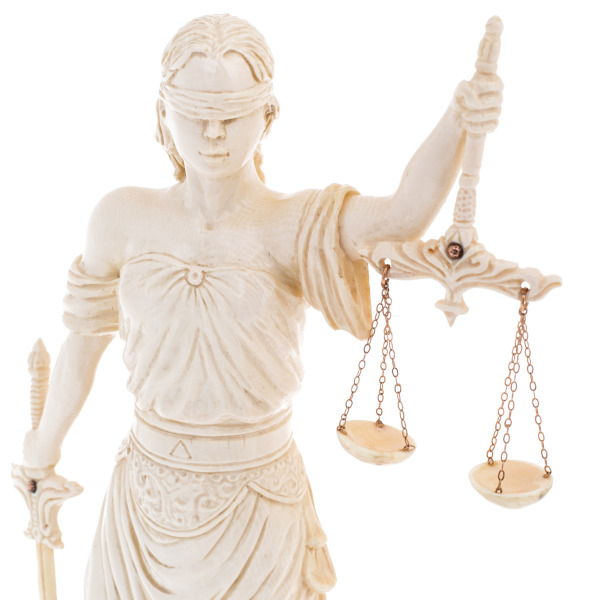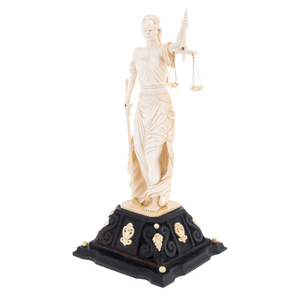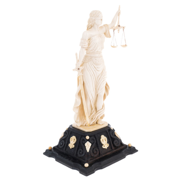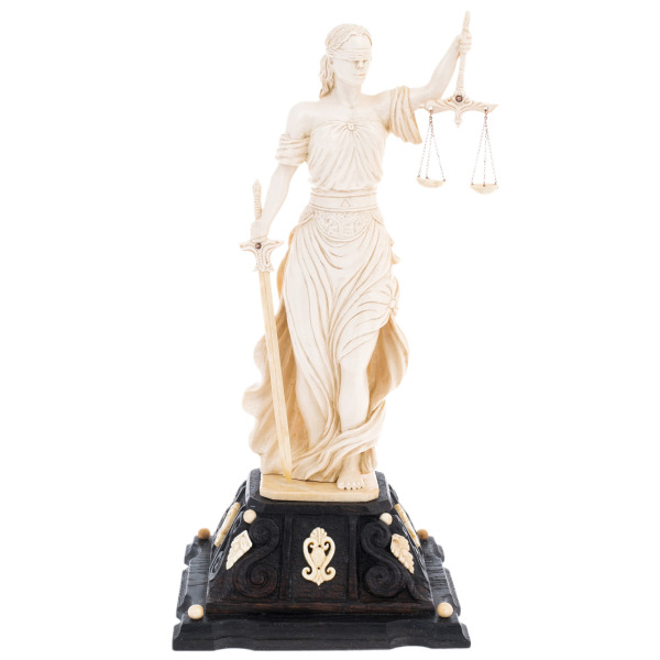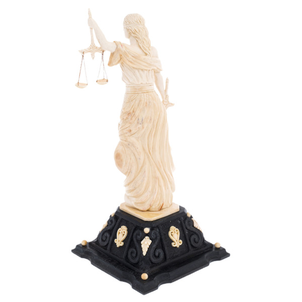 Скульптура из бивня мамонта "Правосудие" — это выразительный символ закона, чести и человеческой совести, воплощённый в материале, хранящем дыхание ледниковой эпохи. Перед нами — Фемида, богиня правосудия, с повязкой на глазах, с мечом в одной руке и весами — в другой. Её поза величественна и непоколебима: плавные складки одежды ниспадают вдоль корпуса, а каждая деталь — от тонкой резьбы по рукояти меча до узоров на лифе — выполнена с предельной тщательностью. Скульптура установлена на массивной чёрной подставке с декоративными элементами, создающими контраст и подчёркивающими благородство облика.