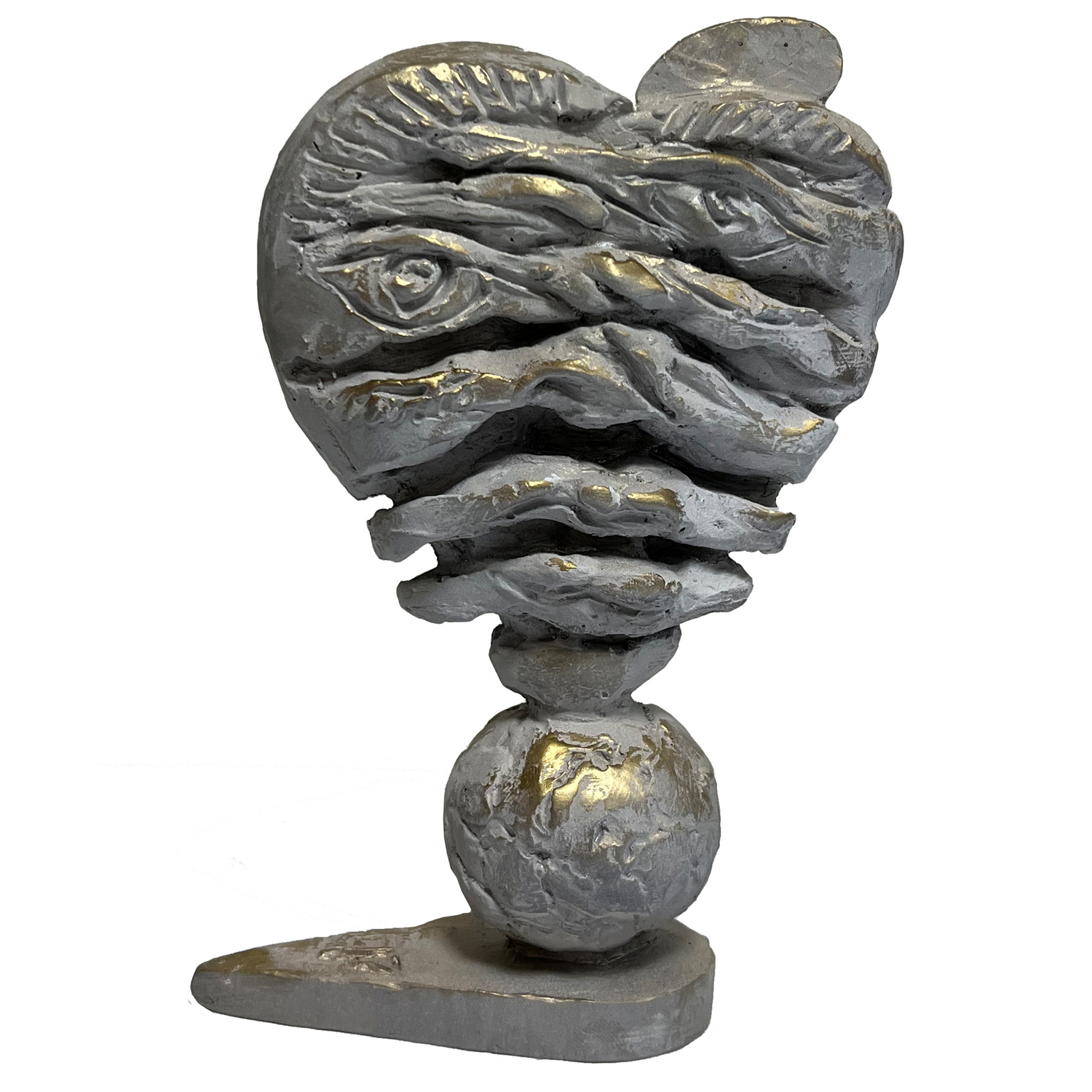 Скульптура “Лав” — смелое пластическое высказывание, где символика сердца сплетается с элементами зрения, чувства и телесной материальности. Выполненная из гипса с серебристо-серой патиной и фрагментами золотого сияния, форма словно собрана из рваных слоёв — как будто сердце пережило множество опытов и теперь несёт на себе следы прожитых эмоций. Внутри этой сложной структуры угадываются глаза, губы, веки — анатомические метафоры любви, страдания, наблюдения и памяти. Скульптура балансирует на шаре, словно указывая на неустойчивость чувств, хрупкость равновесия и непредсказуемость движения.