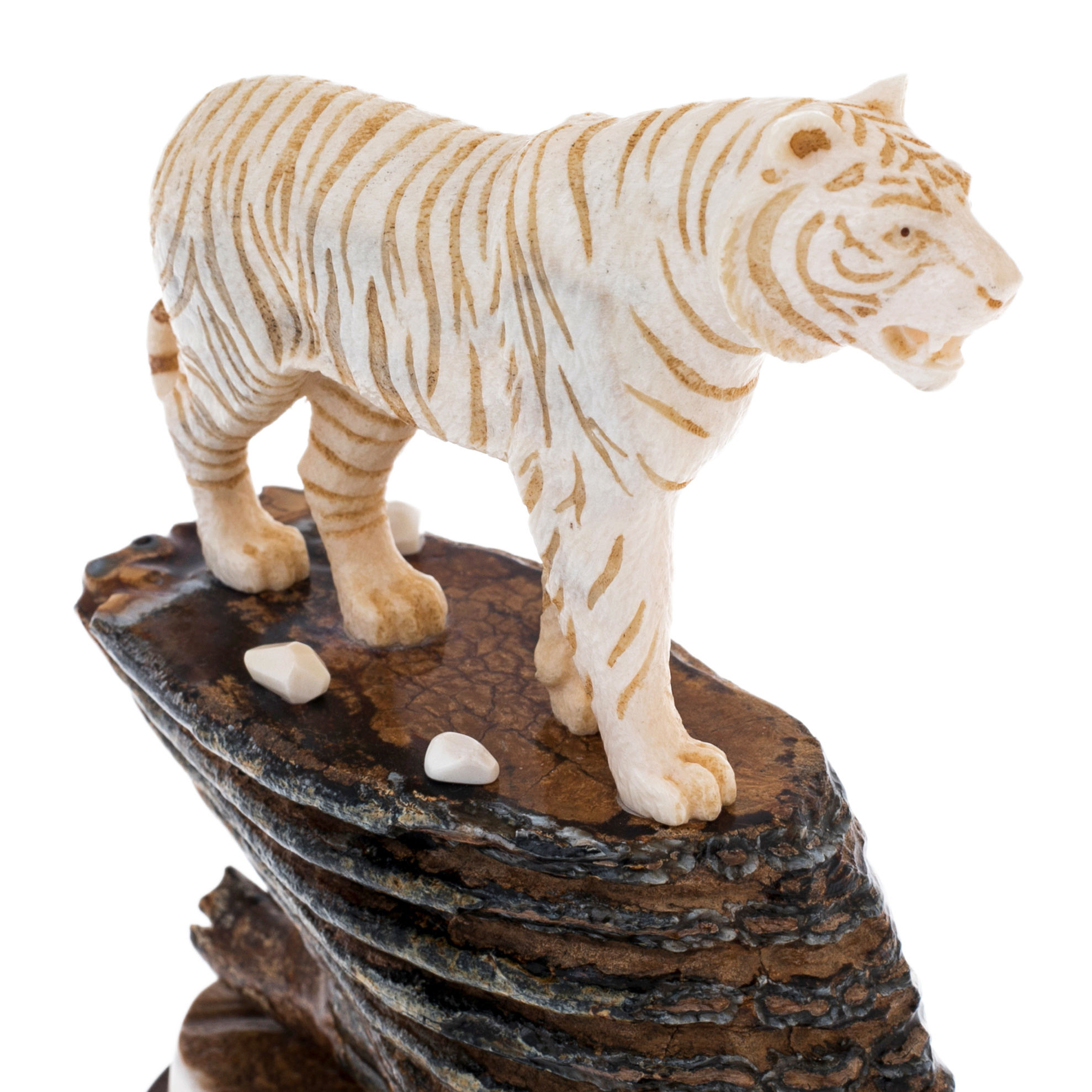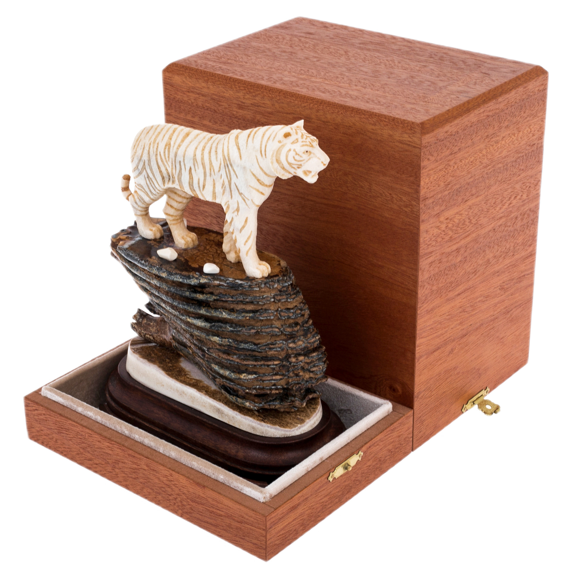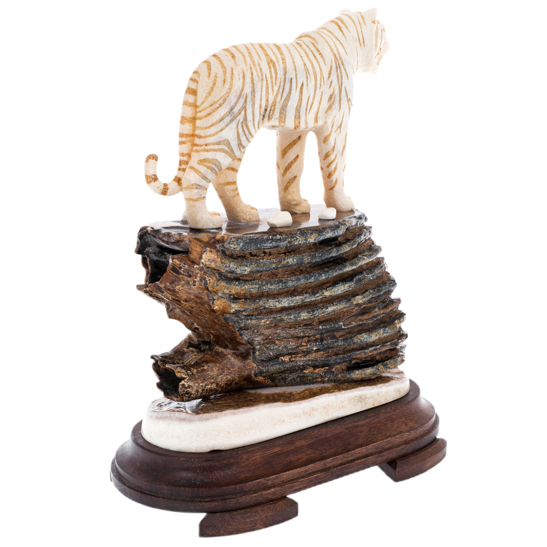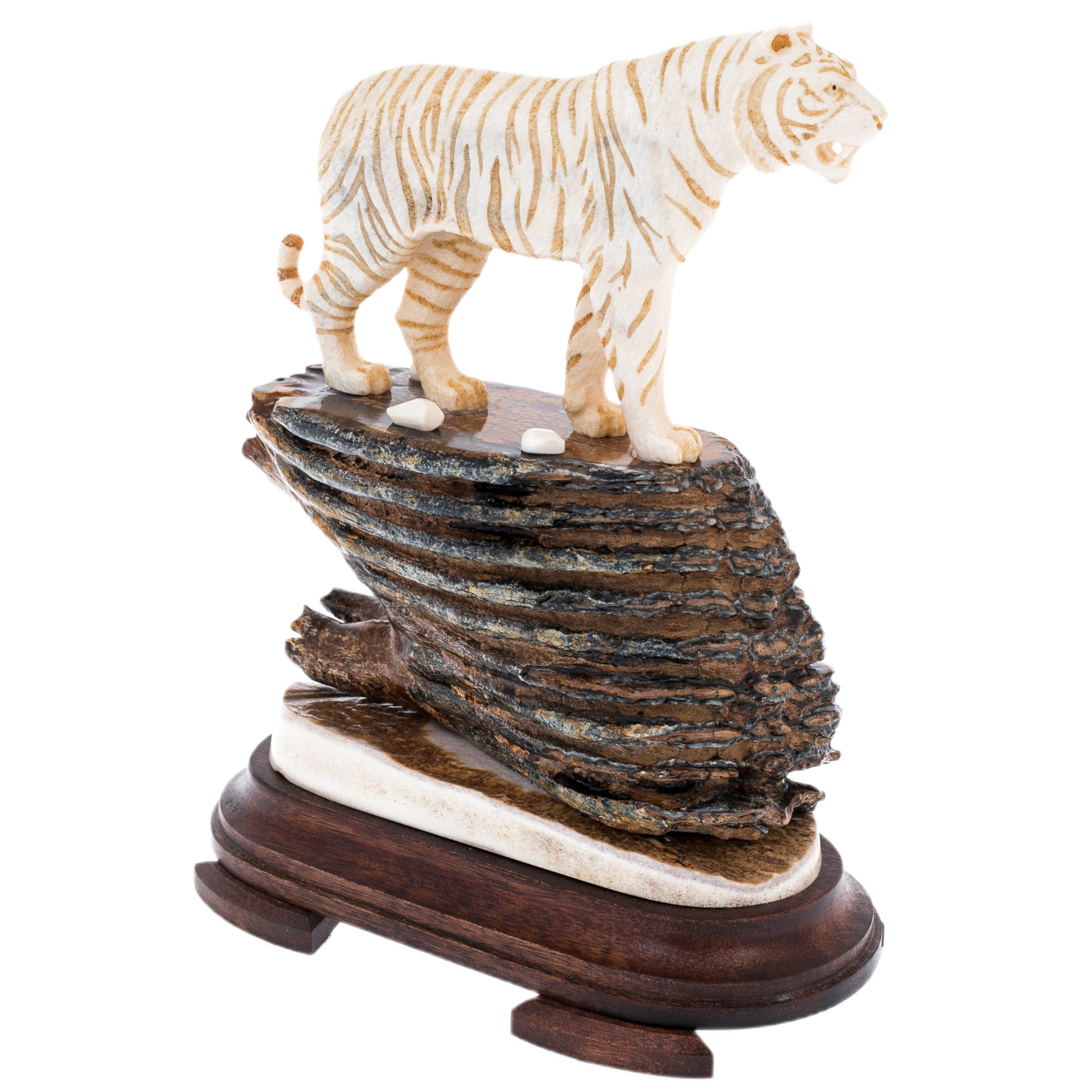 Скульптура из зуба мамонта, рога лося и красного дерева "Тигр"