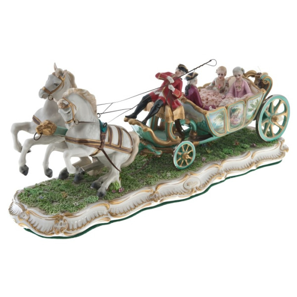 Композиция создана вручную из фарфора исключительной белизны и прочности, прошедшего несколько этапов обжига. Роспись выполнена вручную в сложной цветовой гамме с использованием золота, пастельных тонов и живописных миниатюр на боковинах кареты. Изогнутые линии рамы, витиеватые колёса, пышные оборки платьев, тщательно проработанные гривы и сбруя лошадей — всё свидетельствует о высочайшем художественном уровне исполнения. Подставка из фарфора оформлена в стиле XVIII века с золотым рельефом, придающим скульптуре завершённость музейного экспоната.