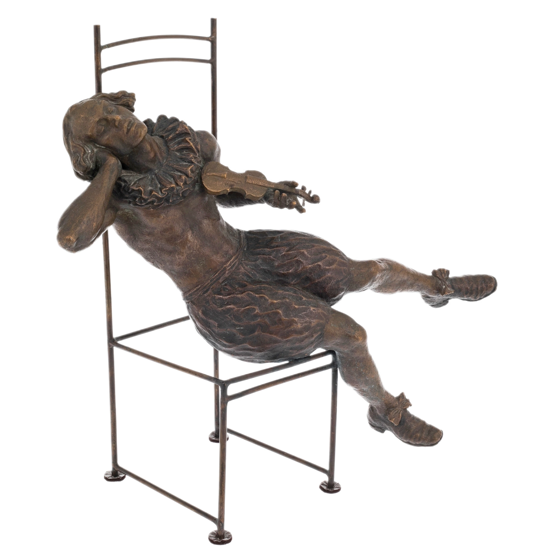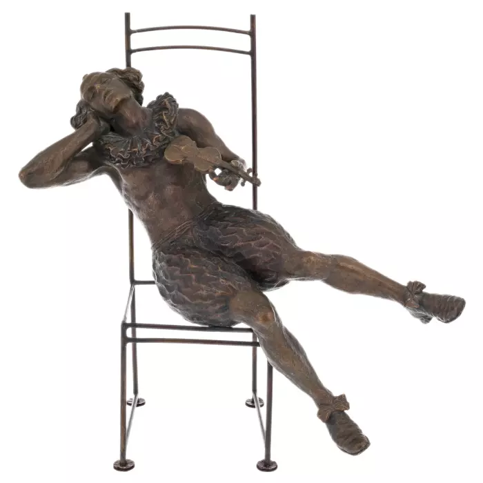 Станковая скульптура «Сон» — выразительное произведение из бронзы, передающее состояние покоя и внутреннего погружения через пластически выверенный образ. Фигура, свободно раскинувшаяся на изящном стуле, словно растворяется в моменте отдыха: расслабленная поза, мягкий изгиб корпуса и чуть запрокинутая голова создают ощущение полной отрешённости от внешнего мира. В руках — скрипка, не как инструмент действия, а как тихое напоминание о музыке, звучащей уже внутри.