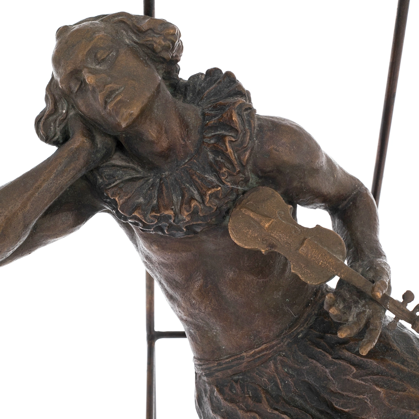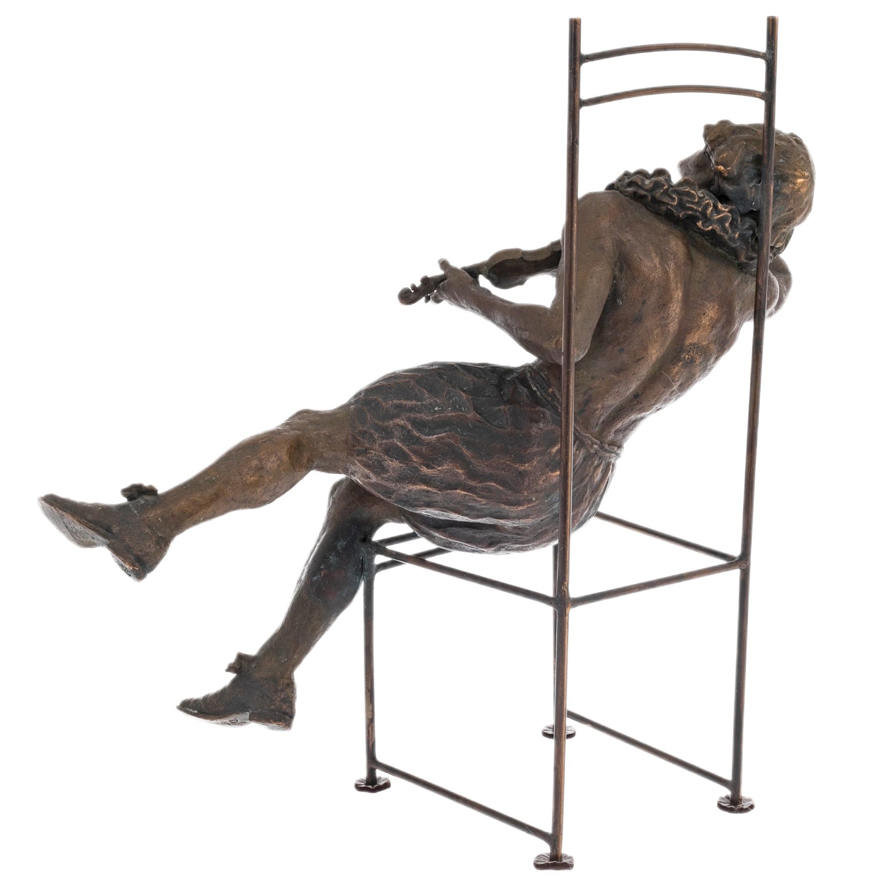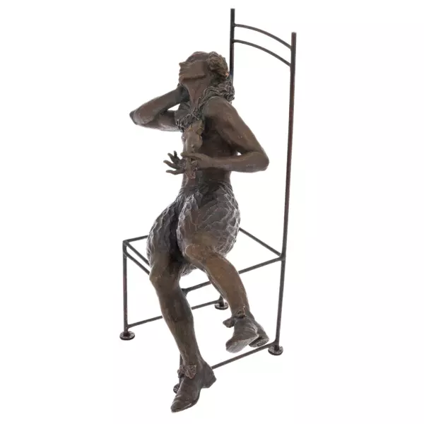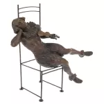 Работа отличается тонкой проработкой анатомии и деталей: фактура ткани, плавные линии тела, лёгкая небрежность позы переданы с точностью и художественным чувством. Контраст между строгой геометрией металлического каркаса стула и живой, текучей пластикой фигуры усиливает выразительность композиции. Бронзовая поверхность с благородной патиной придаёт глубину образу и подчёркивает игру света на рельефах, делая каждую деталь читаемой и выразительной.
