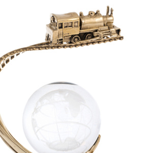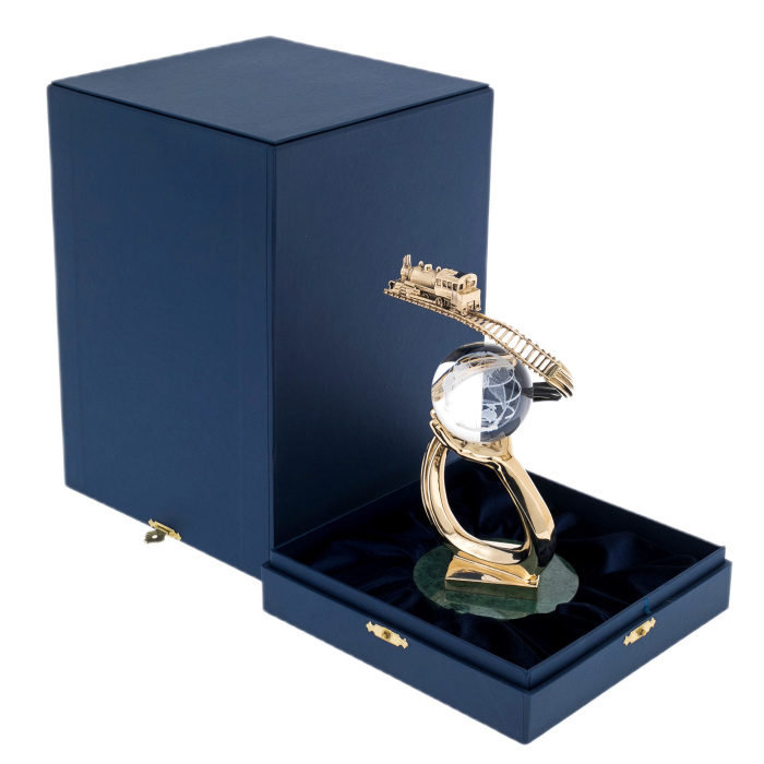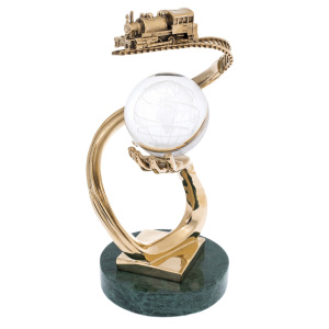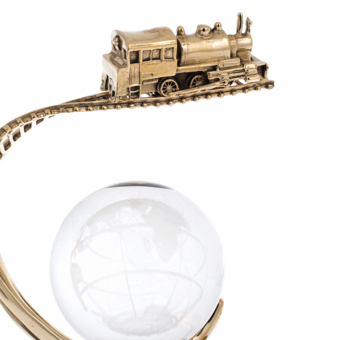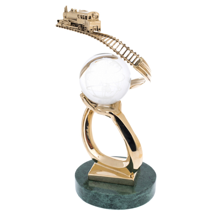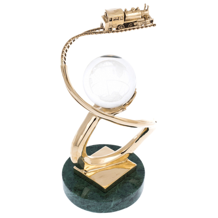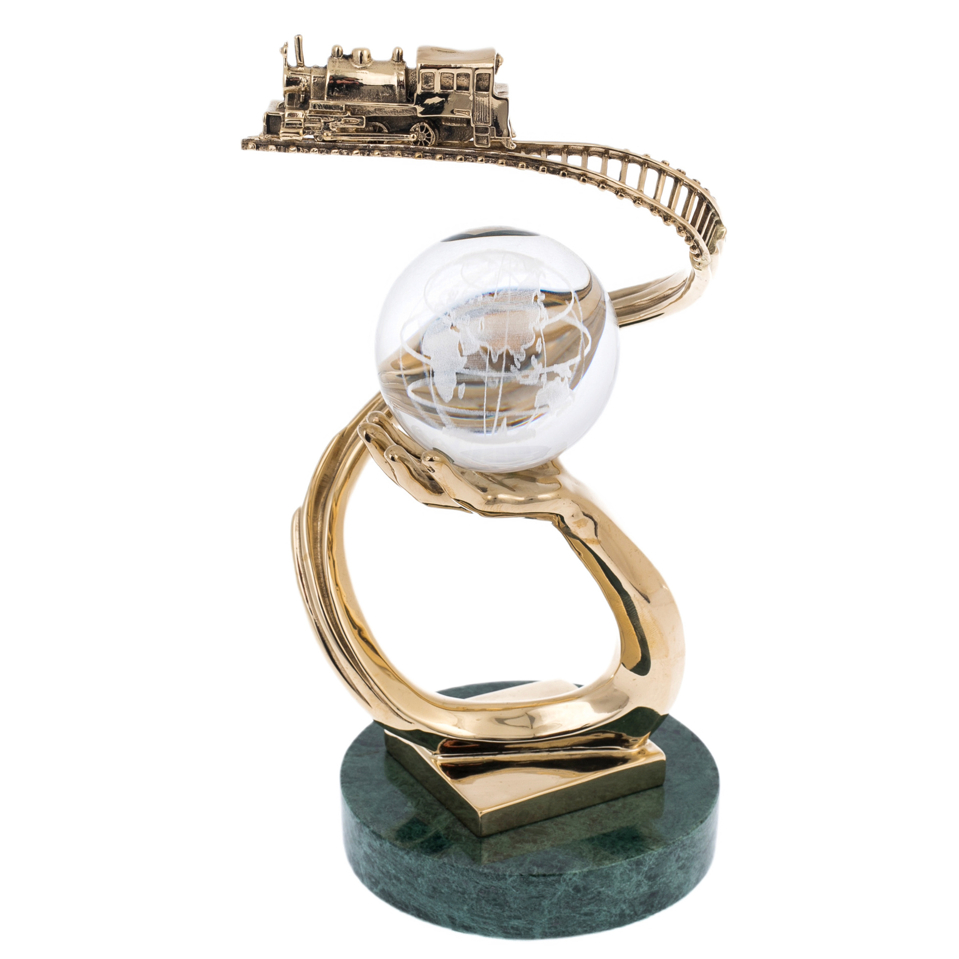 Основание выполнено из камня глубокого зелёного тона с природным рисунком, подчёркивающим статус и устойчивость, сверху закреплена металлическая платформа с тёплым золотистым блеском. Над ней поднимается пластичная, зеркально отполированная дуга, переходящая в ладонь с тщательно проработанной анатомией: пальцы поддерживают сферу, не перетягивая внимания на себя. Шар из прозрачного стекла или хрусталя украшен матированным изображением контуров материков и линий сетки, благодаря чему в толщине материала читается “карта мира”, играющая светом при каждом повороте. Над сферой проходит тонкая, изящно изогнутая рельса с детализированными шпалами, по ней движется миниатюрный паровоз, выполненный в рельефе — с кабиной, котлом, трубой и мелкими конструктивными акцентами, придающими модели убедительность.