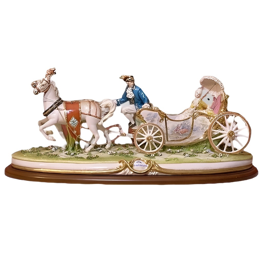 Фарфор высочайшего качества расписан вручную: нежные лица, текстуры тканей, детали экипажа — каждая грань вылеплена с ювелирной тщательностью. Цветовая гамма выдержана в пастельных тонах с акцентами золота, розового, лазури и слоновой кости. Основание композиции, выполненное в форме овального пьедестала с декоративной вставкой и табличкой «Capodimonte», подчеркивает принадлежность изделия к великой традиции итальянского фарфора, известного своей театральной выразительностью и орнаментальной роскошью.