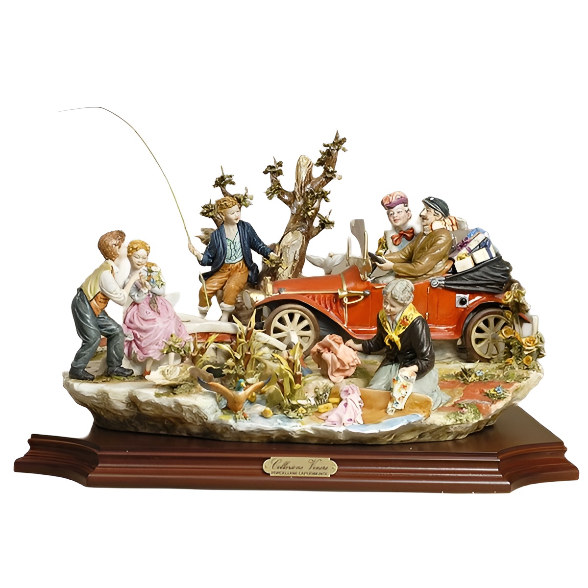 Композиция выполнена из тончайшего фарфора с ручной росписью, покрытой изысканной патиной, придающей объем и глубину каждому лицу, складке ткани, прожилке на листе дерева. Красный кузов автомобиля выделяется на фоне спокойной природы и создаёт акцент, уравновешенный натуральной палитрой костюмов и природных элементов. Мастера филигранно передали характеры героев: от добродушной пары на переднем сиденье до мальчика с хитрой улыбкой и удочкой в руках. Деревья и кустарники моделированы с точной ботанической выразительностью, птицы и ручей дополняют иллюзию живого мира, запечатлённого в фарфоре.