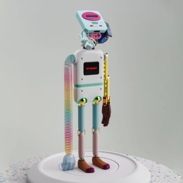 Форма словно собрана из артефактов прошлого и будущего. Голова — игровая консоль, венец технологического прогресса. Левая рука — радужная пружина, символ гибкости времени, играющего с человеком по своим правилам. Правая — механическая конструкция, словно перенесенная из стимпанк-утопии. На ногах — ботинки с оттенком ностальгии, возвращающие к первым шагам в мире игр.