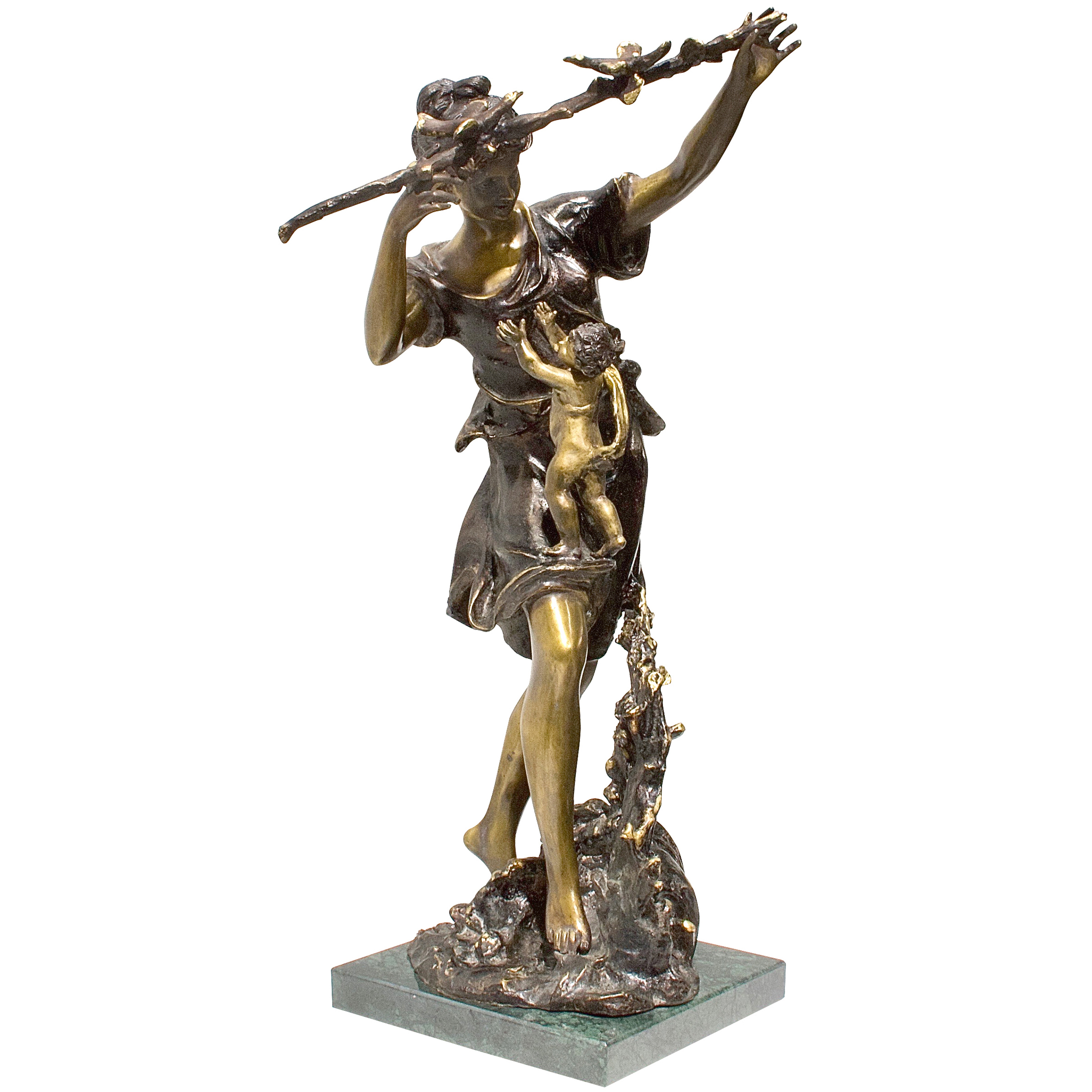 Литая бронза хранит этот миг в вечности. Мраморное основание — алтарь женской силы, прочный как скала. Позолоченные отблески патинированной поверхности напоминают о солнечном свете, согревающем землю.