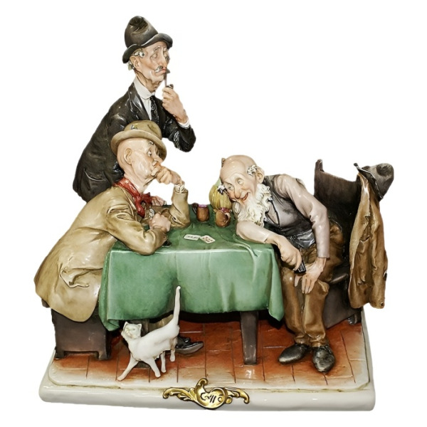 Фарфоровая статуэтка «Карточная игра» — театральная миниатюра из жизни, в которой юмор, характер и внимание к деталям сплелись в единую художественную композицию. За столом, покрытым зелёным сукном, застыла сцена дружеской партии в карты: один игрок задумчиво потирает подбородок, другой хохочет с прищуром, явно довольный своим ходом, третий — наблюдатель — погружён в размышления, прижав палец к губам. Под столом, как финальный штрих к сцене, проходит белая кошка, добавляя уютную, почти кинематографичную достоверность. Весь эпизод полон жизни: взгляды, позы, одежда — всё передаёт атмосферу доброй иронии и негромкой старомодной радости.