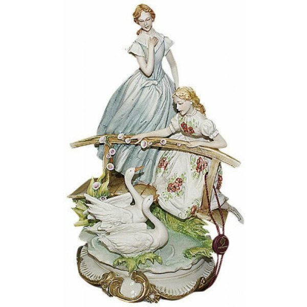 Композиция выполнена из тонкого фарфора с детализированной ручной росписью, сочетающей нежные пастельные оттенки с насыщенными акцентами. Каждое платье украшено сложным орнаментом: флоральным, дамасским, восточным — будто подчёркивая индивидуальность каждой фигуры. Рельефы дерева, фактура одежды, лепестки цветов у подножия и птичье гнездо проработаны с исключительной точностью. Перламутровый блеск глазури, утончённая лепка лиц и благородное основание с ажурным золотым декором делают это произведение не просто интерьерным украшением, а музейным экспонатом в частной коллекции.
