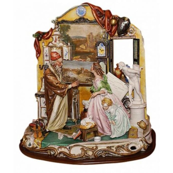 Фигура каждого персонажа передана с мастерством, характерным для итальянской школы фарфора середины XX века: слегка преувеличенные черты лица, тщательно вылепленные руки, складки одежды, фактура ткани и даже потертости на ботинках. Глянцево-матовая поверхность изделия подчёркивает естественность сцены. Цветовая палитра выдержана в тёплых, земных тонах: охра, терракота, оливковый, пепельный — создающих эффект художественного натюрморта. Всё размещено на овальном постаменте с рельефной позолотой, подчёркивающей музейное достоинство композиции.