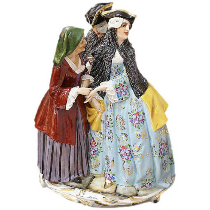 Фарфоровая статуэтка «Гадалка» — жанровая сцена, в которой театральность венецианской жизни обретает хрустальную материальность. На узкой мостовой, между тенями арок и шелестом плащей, пожилая женщина в бордовом камзоле и зелёном платке склонилась над ладонью юной дамы. Лицо девушки, скрытое под кружевной мантильей и полумаской, озарено улыбкой — то ли от кокетства, то ли от суеверного трепета. За её плечом — мужчина в треуголке, наблюдающий за происходящим с любопытством или ревностью. В этой композиции нет случайных движений: каждая поза, каждый взгляд создаёт атмосферу тайны и игры.