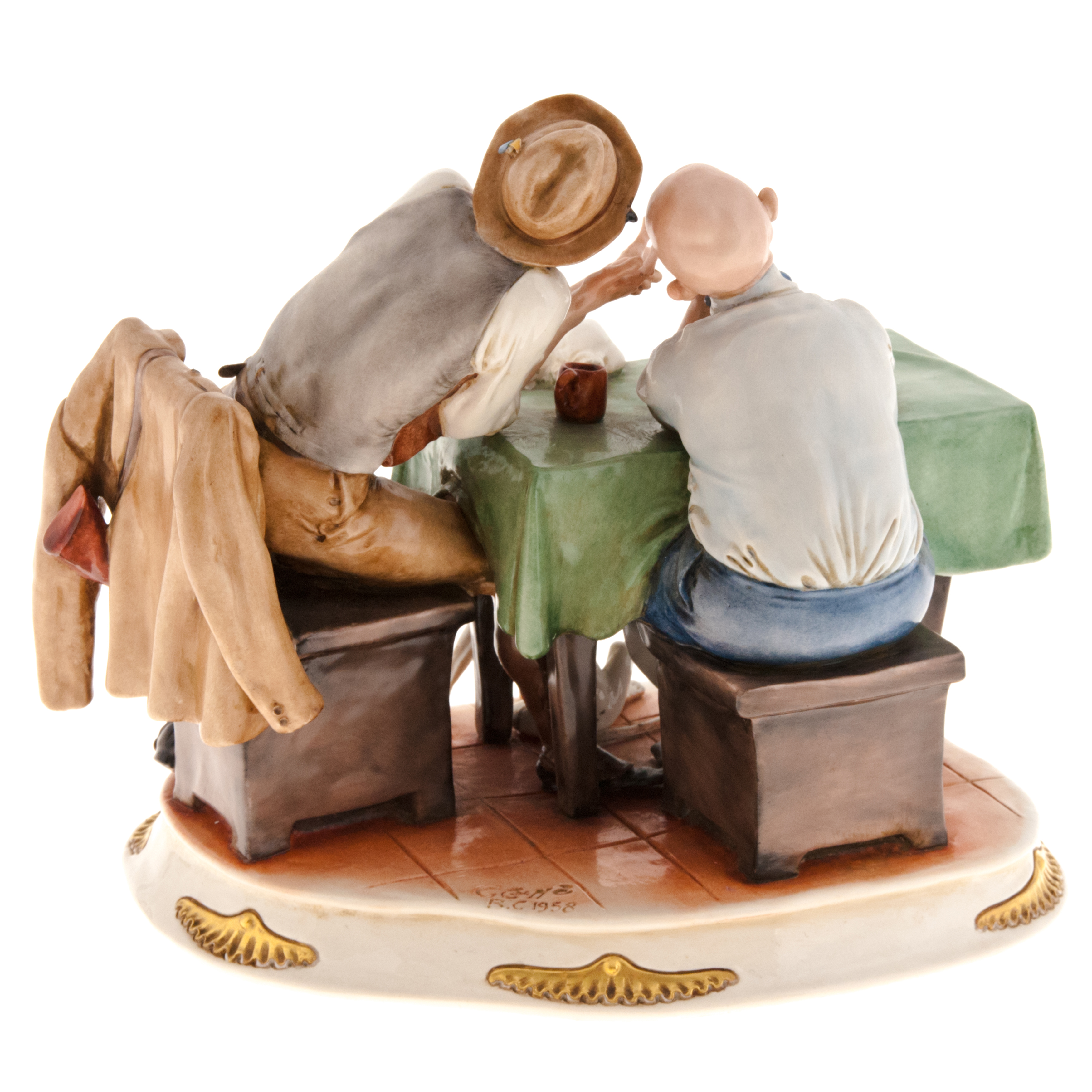 Фигура каждого персонажа передана с мастерством, характерным для итальянской школы фарфора середины XX века: слегка преувеличенные черты лица, тщательно вылепленные руки, складки одежды, фактура ткани и даже потертости на ботинках. Глянцево-матовая поверхность изделия подчёркивает естественность сцены. Цветовая палитра выдержана в тёплых, земных тонах: охра, терракота, оливковый, пепельный — создающих эффект художественного натюрморта. Всё размещено на овальном постаменте с рельефной позолотой, подчёркивающей музейное достоинство композиции.