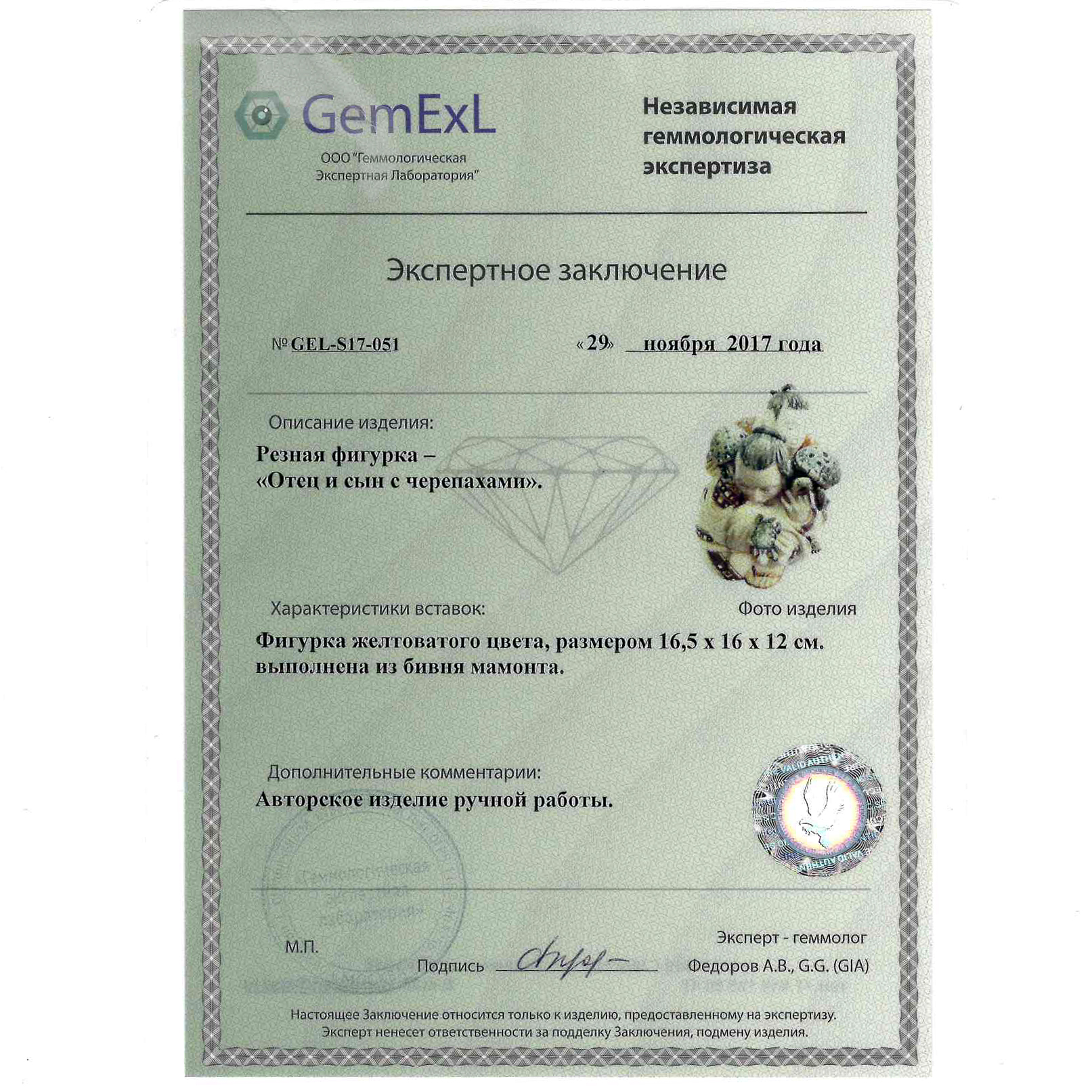 Свет теплой слоновой кости, запечатленный в вечности, раскрывает историю, полную нежности, заботы и вечной связи поколений. В этом шедевре из бивня мамонта два силуэта сливаются в сцену, наполненную жизнью: отец, опустившись на колено, с улыбкой наблюдает за игрой сына, который с восторгом изучает мир. Но их внимание поглощено не друг другом, а существами, несущими в себе символику мудрости, терпения и неумолимого течения времени — черепахами.