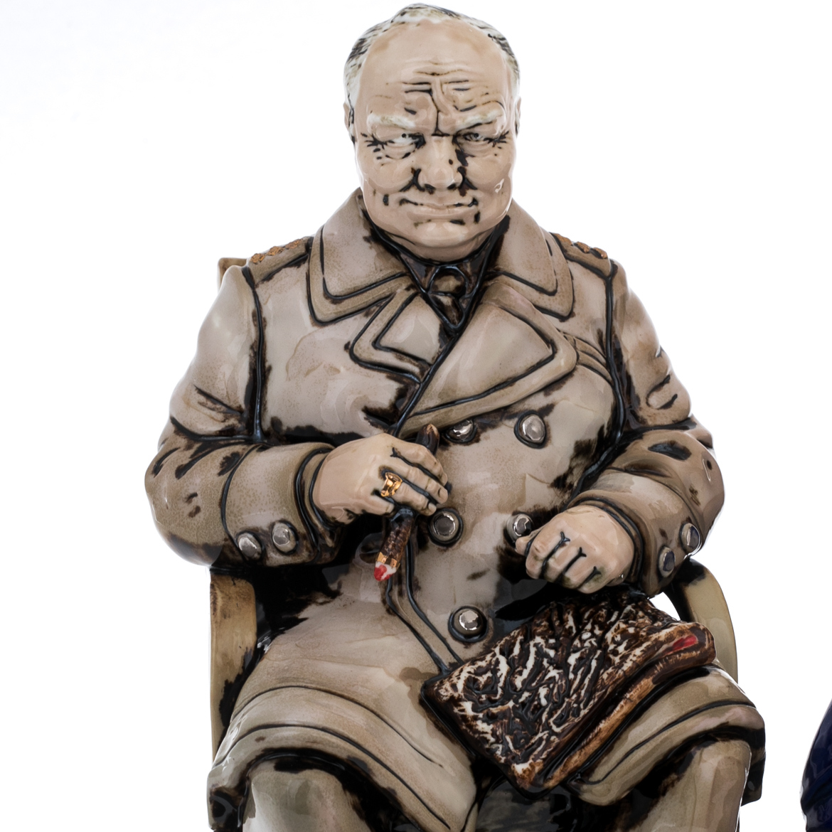 Набор статуэток «Ялтинская конференция 1945 года» — коллекционное произведение, созданное из фарфора высокого художественного уровня, отражающее один из ключевых моментов мировой истории. На постаменте размещены три фигуры — лидеры стран антигитлеровской коалиции: Уинстон Черчилль, Франклин Рузвельт и Иосиф Сталин. Мастер передал не только портретное сходство, но и характеры, отражённые в позах, жестах, выражении лиц. Это не просто фигурки, а тщательно проработанная сцена, в которой каждая деталь — от складки шинели до архитектуры кресел — имеет историческое и пластическое значение.