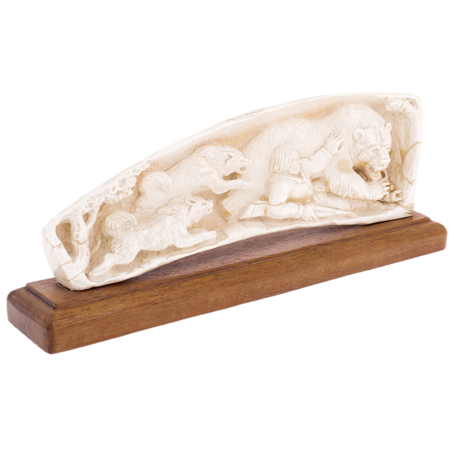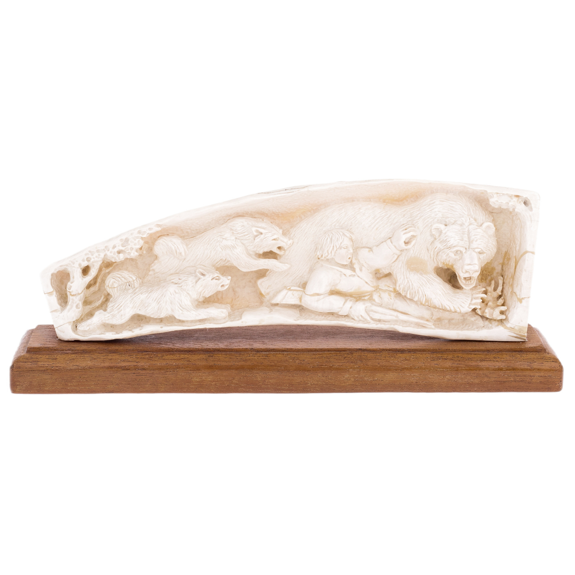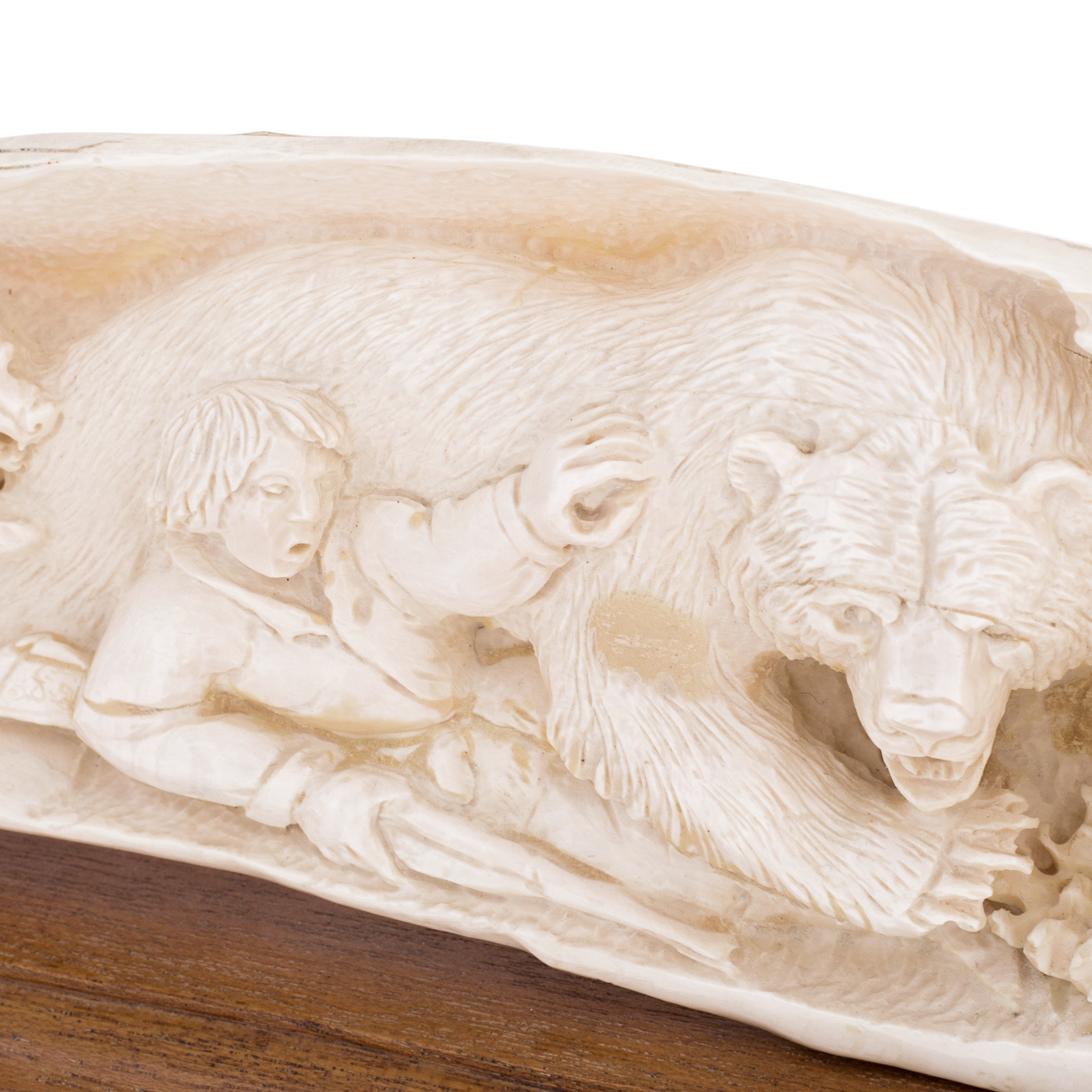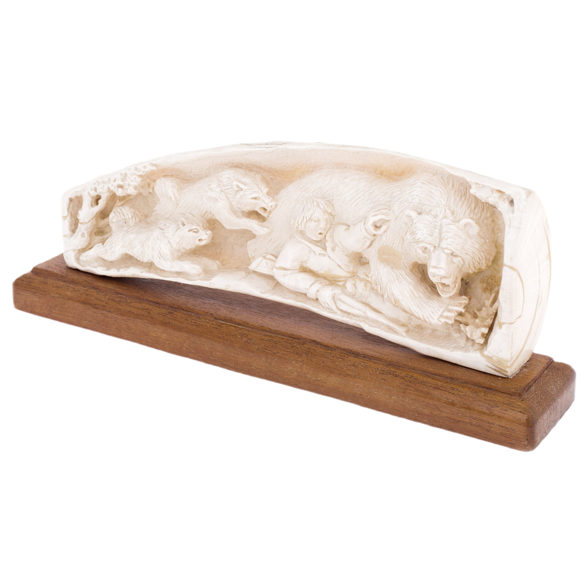 Композиция из бивня мамонта «Охота» — тонко вырезанный барельеф, заключённый в массив древнего ископаемого материала, хранящего следы ледниковой эпохи. На вытянутой пластине, установившейся на строгую деревянную подставку, разворачивается сцена драматичной схватки: человек, оказавшийся лицом к лицу с медведицей, защищающей потомство, против ярости хищной природы. В динамике фигур, прорезанных с поразительной точностью, ощущается напряжение момента — бегущие волки, сжавшиеся от страха детёныши, разъярённое животное, и человек, замерший в безвыходном положении. Композиция требует не просто взгляда, а вдумчивого рассматривания — лишь тогда раскрываются детали: изгиб ветвей, выражение морд, едва заметные складки одежды.