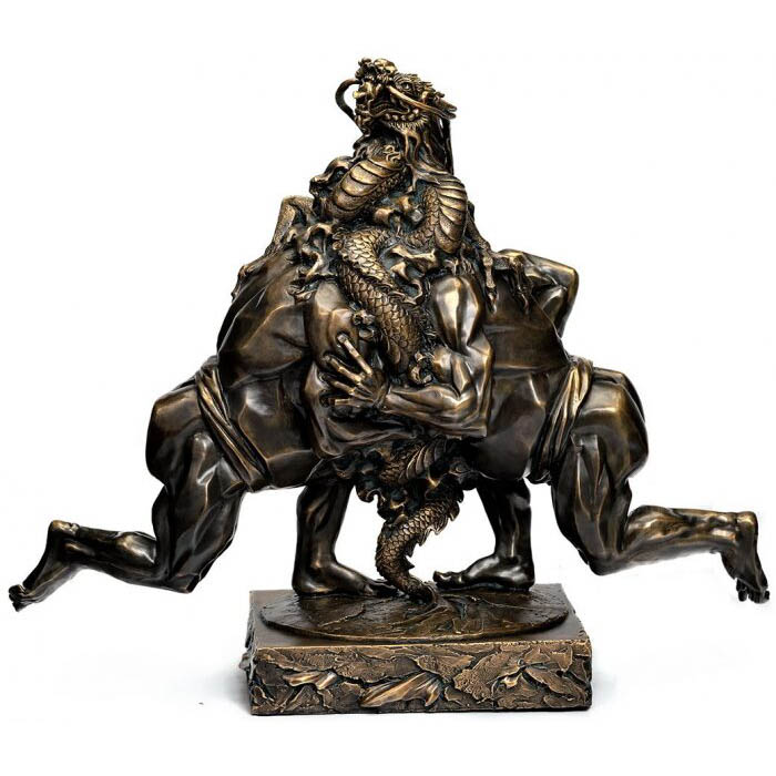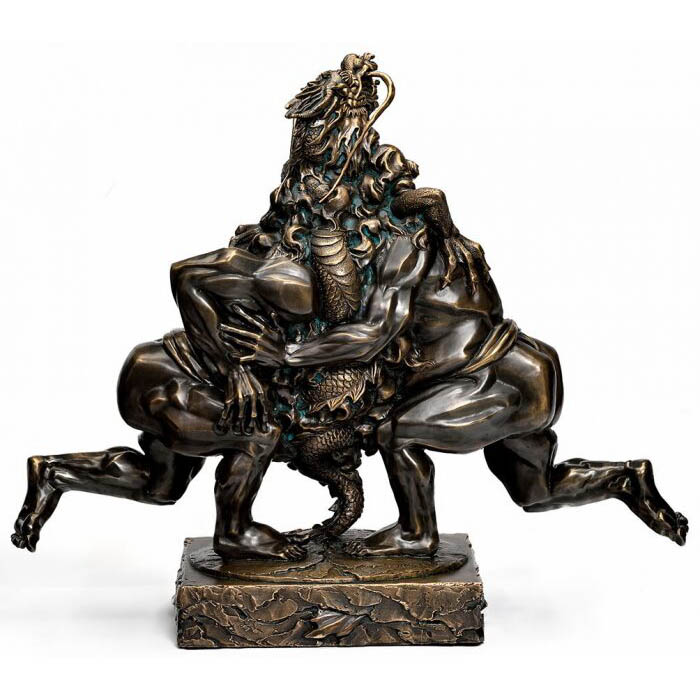 В вихре бронзы сплелись два начала — человеческая мощь и змеиная хитрость, мужество воина и коварство хищника. Взгляд цепляется за каждый изгиб: напряжённые мускулы противоборствующих титанов, впившиеся в плоть пальцы, извивающийся по их спинам дракон, чья пасть раскрыта в безмолвном рёве. Это не просто схватка, это извечная битва стихий — разум против инстинкта, воля против рока, сила против иллюзии контроля.