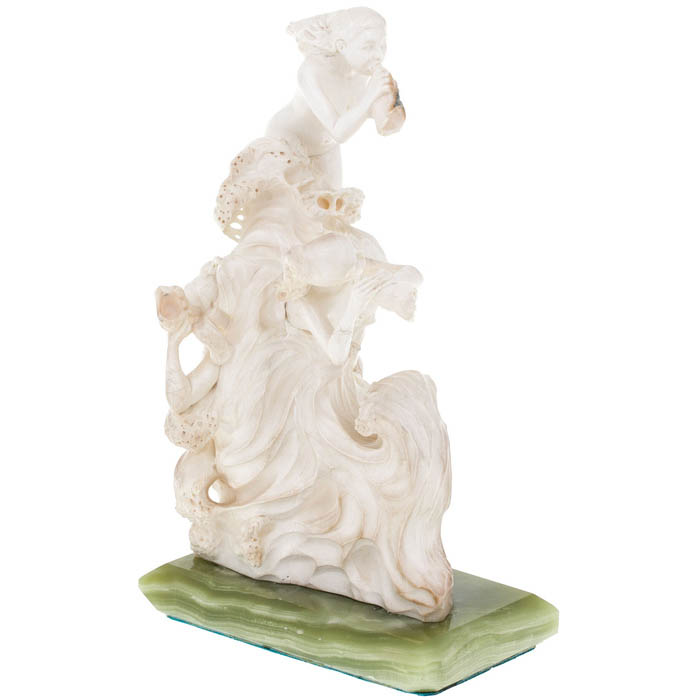 Скульптурная композиция «Сирены Одиссея» — редкий образец камерной пластики, воплощающий сюжет, пропитанный древнегреческим мифом и тонким символизмом. Выполненная из цельного бивня мамонта, скульптура отражает момент томительного соблазна: три сирены, прильнув к раковинам, внимают собственному пению, рождая волну, облекающую их тела. Волны словно текут по их фигурам, сливаясь с извивами ткани, камня и морской пены, превращаясь в единый поток. Детали — вплоть до завитков волос, складок драпировок и отверстий в раковинах — исполнены с филигранной точностью, подчёркивающей одновременную плотность и легкость материала. Композиция покоится на основании из полированного нефрита, подчеркивающего морскую тему и придающего образу завершённость.