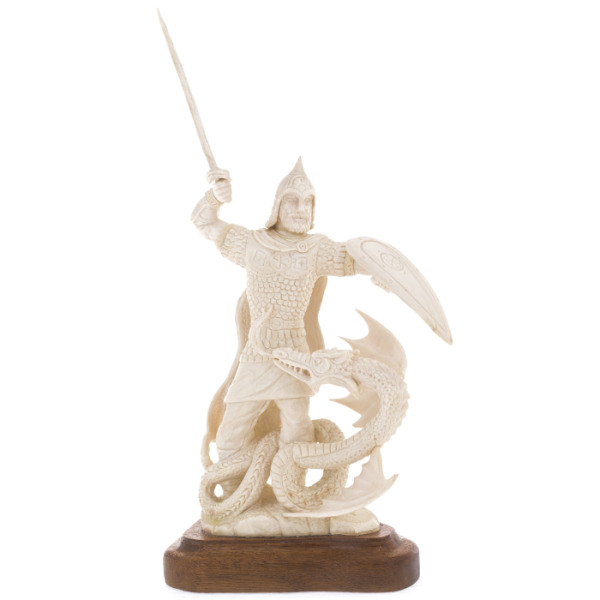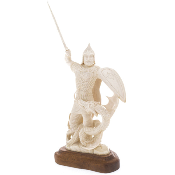 Каждая деталь этой композиции выполнена с невероятным мастерством, демонстрируя искусство резьбы по кости высочайшего уровня. Могущественный богатырь Илья Муромец изображен в момент победы над змеем Горынычем. Его фигура, воплощенная в прочных формах и уверенных линиях, олицетворяет несокрушимую силу и отвагу. Дракон, извивающийся у его ног, символизирует победу добра над злом, силы духа надо всеми трудностями.