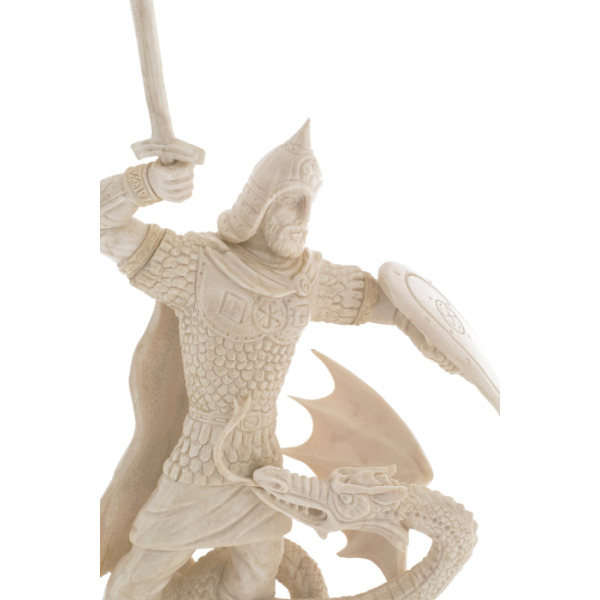 Композиция установлена на элегантной мраморной подставке, которая не только придает скульптуре устойчивость, но и подчеркивает ее величие. Мраморная основа символизирует неподвижность и вечность, создавая контраст с динамичной фигурой Георгия и побежденного дракона.