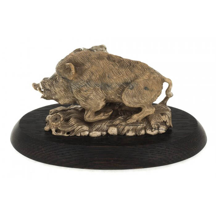 Скульптурная композиция «Охота на кабана с ягдтерьером» — произведение ручной пластики, воплощающее момент дикого инстинкта и охотничьей отваги. В одном застывшем движении слились два антагониста: кабан, вырвавшийся из чащи, с оголёнными клыками и мощной мускулатурой, и смелый ягдтерьер, вцепившийся в шею зверя. Художественная энергия, заключённая в этом контрасте, подчёркивается рельефной проработкой шерсти, анатомии и текстуры лесного грунта. Каждая деталь исполнена с почти анатомической точностью, создавая живое напряжение в миниатюре. Композиция возвышается на овальном основании из тёмного морёного дуба, добавляющего глубины и визуального веса всей сцене.