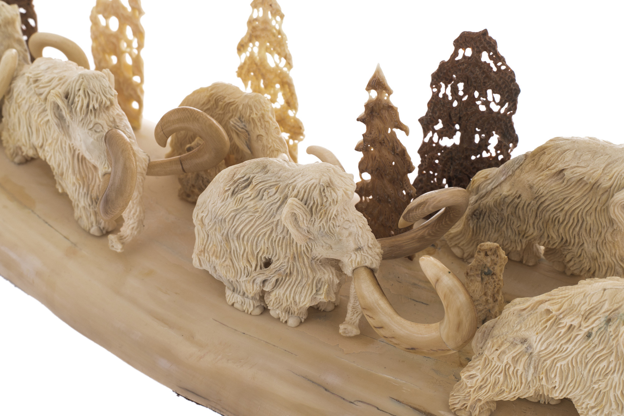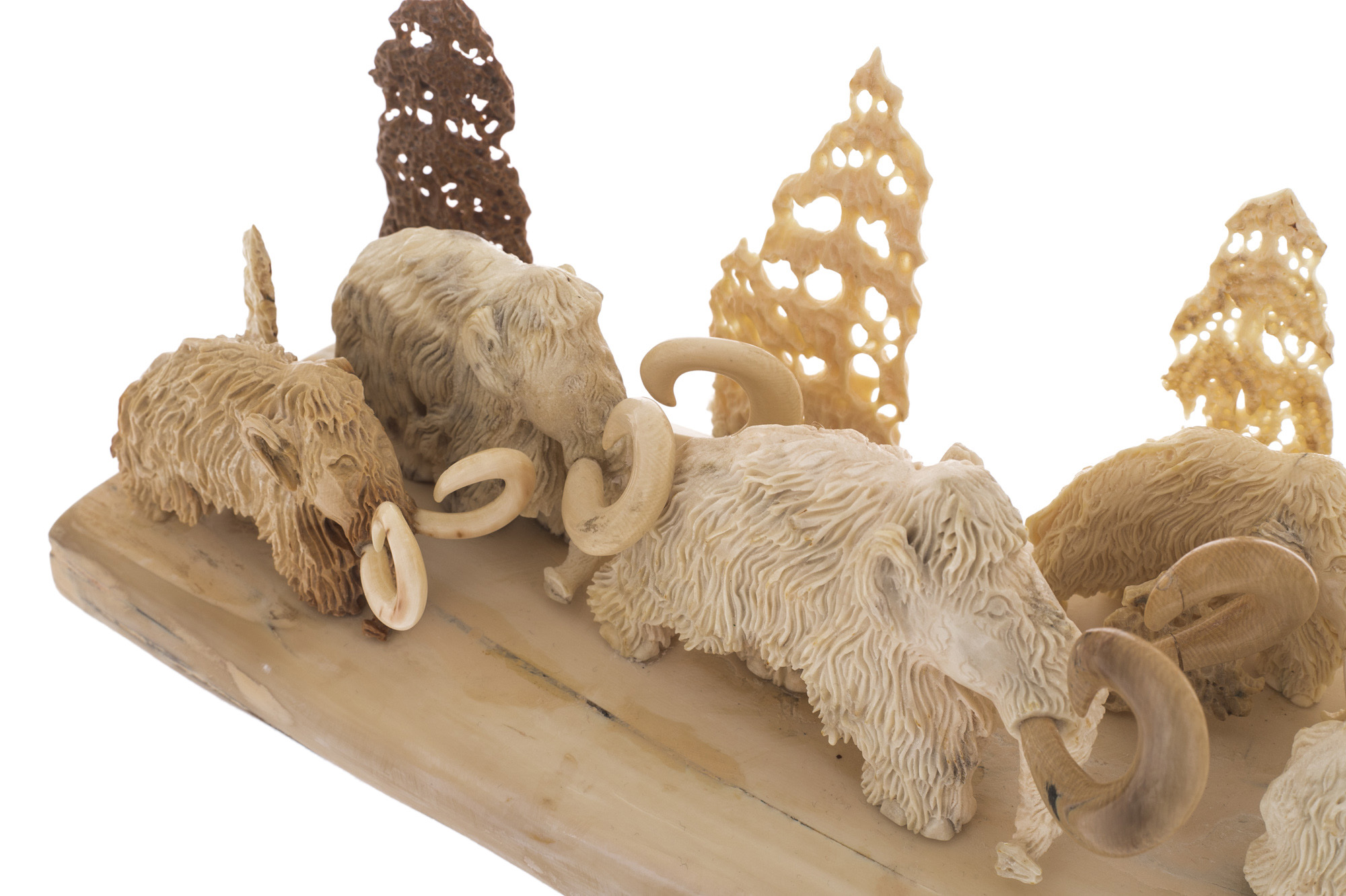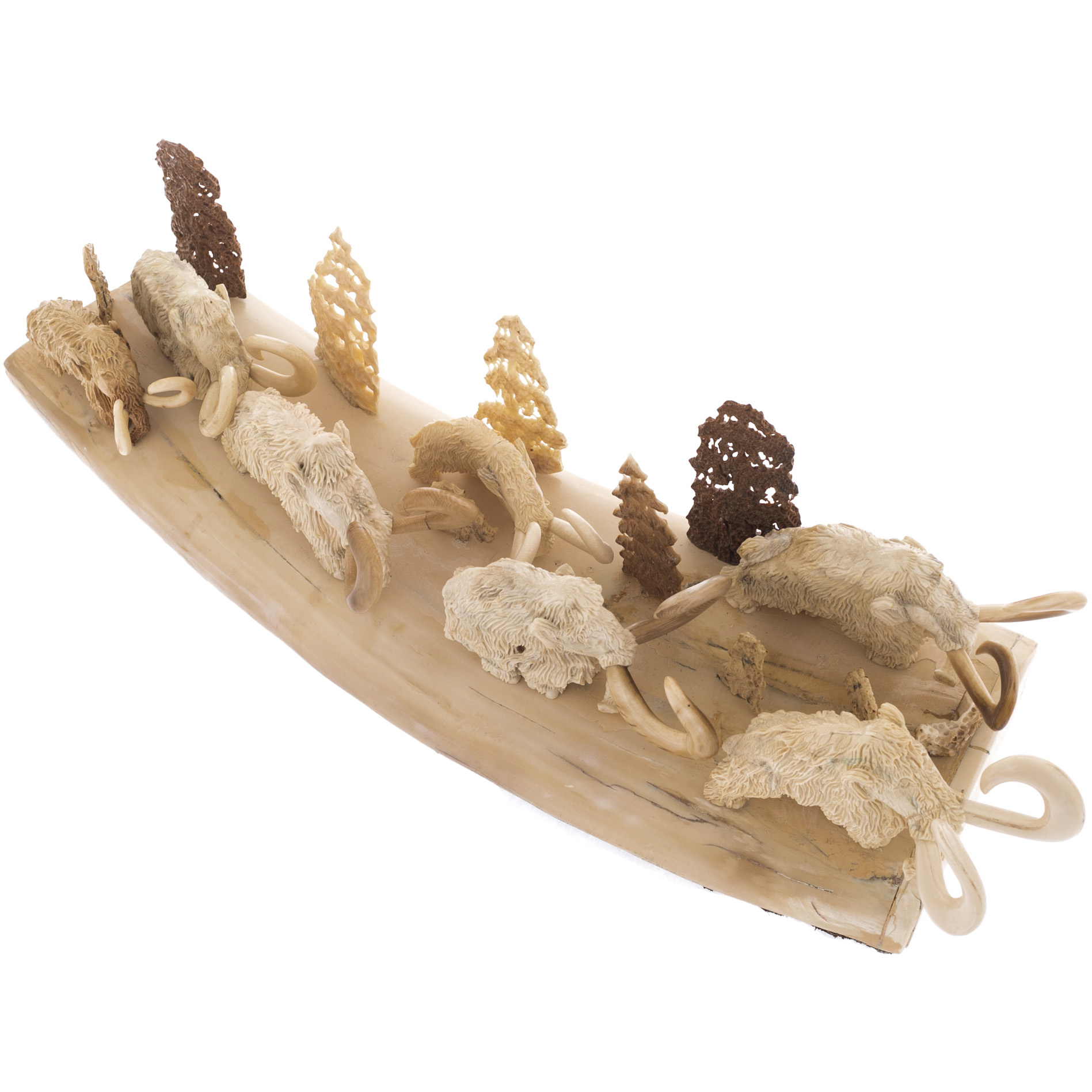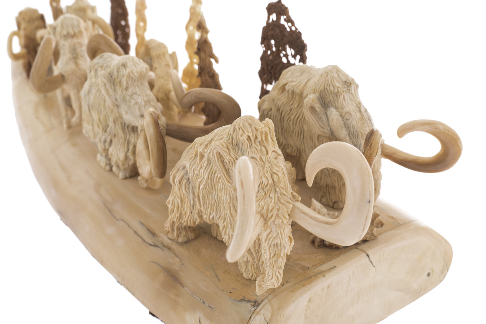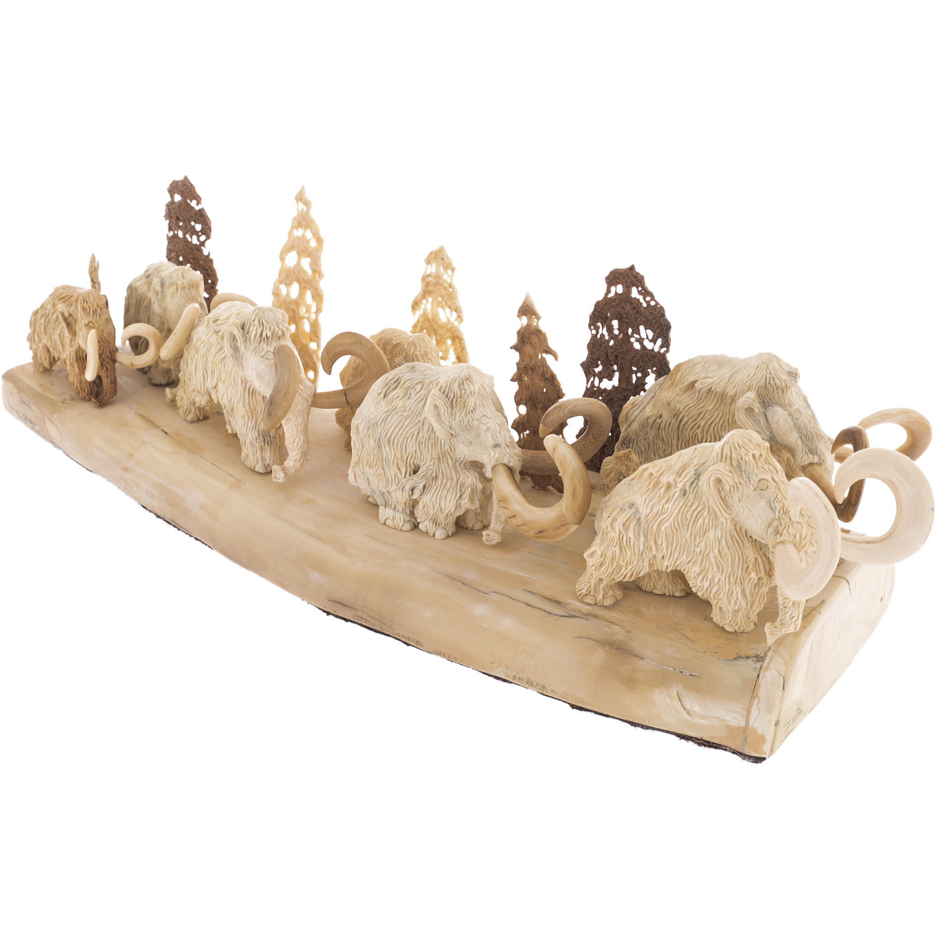 Композиция из бивня мамонта "Трудный переход" с 7 мамонтами