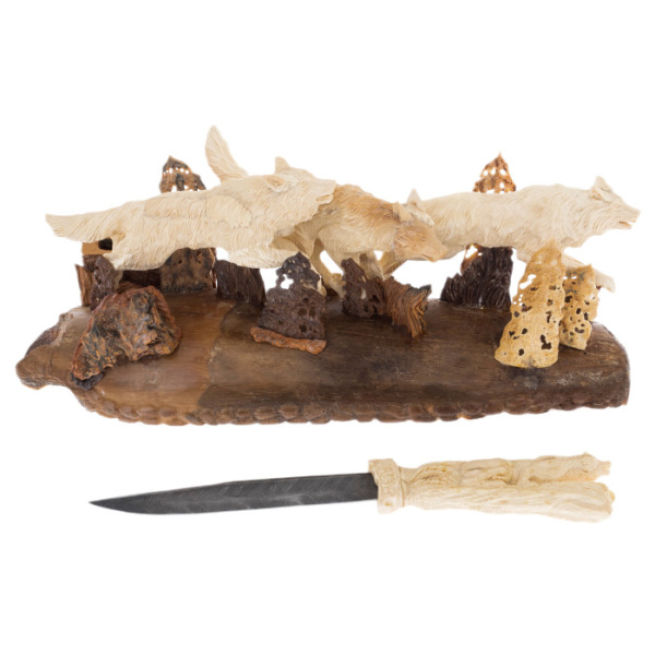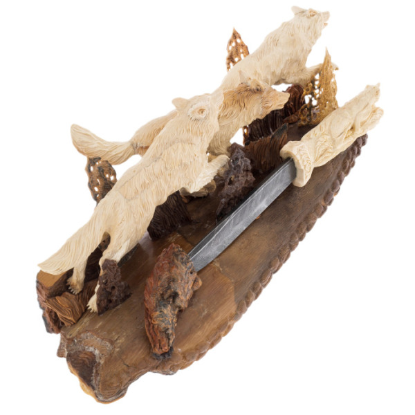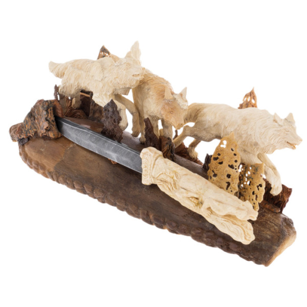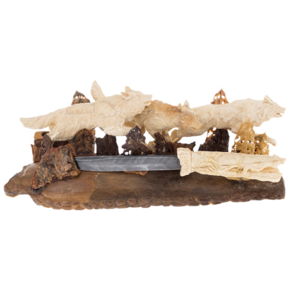 Главный элемент композиции — помещенный среди волков нож. Изготовленный из дамасской стали, он является не просто декоративным элементом, но символом защиты, власти и решительности. Его рукоятка, украшенная резьбой в виде волков, продолжает общую тему композиции, создавая целостный и гармоничный образ. Этот нож — воплощение силы и контроля, он подчеркивает не только мастерство его создателей, но и статус его владельца.
